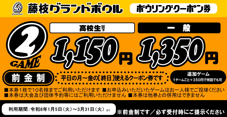 平日2ゲームクーポン | 藤枝グランドボウル MENU