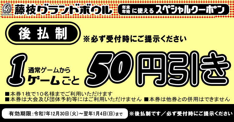 ■本券1枚で10名様までご利用いただけます■本券はレーン予約、大会及び団体予約等にはご利用いただけません■本券は他券との併用はできません■後払制となります。必ず受付時にご提示ください■高校生以下については学生証のご提示をお願いする場合があります■本券は藤枝グランドボウルのみ有効です■貸靴代別途:400円/1足