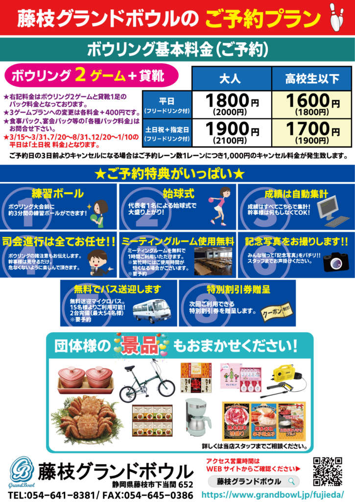 藤枝グランドボウルであれば、高速道路にも近いし、レーン数は40レーン、100名程度着席可能な会議室もあり、駐車場も広くて、、とっても便利!!