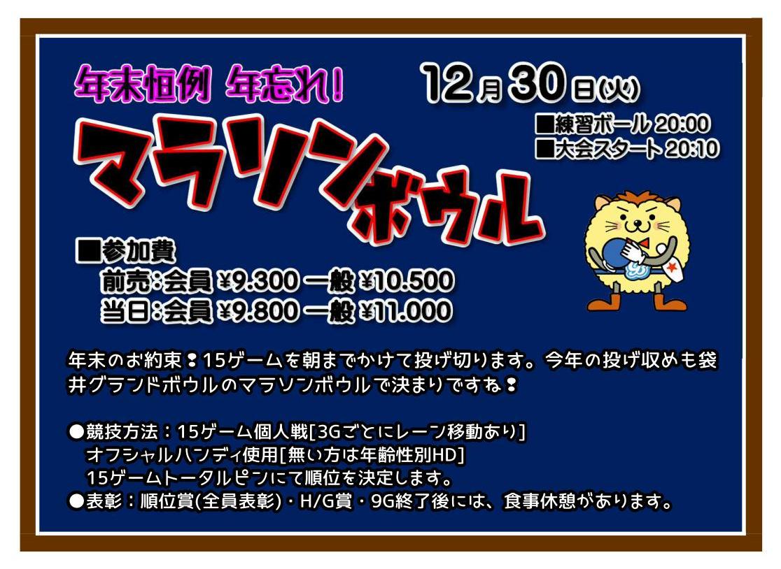 こちらも年末恒例のマラソンボウルです。今年はスタート時刻を午後5時として15ゲームを投げ切ります。