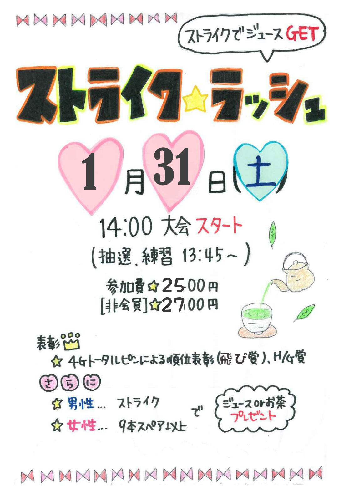 ◆表彰:①順位表彰(飛び賞)②スクラッチH/G賞③ストライク賞(男性はストライク、女性はストライクまたは9本スペアでジュースorお茶をプレゼント)