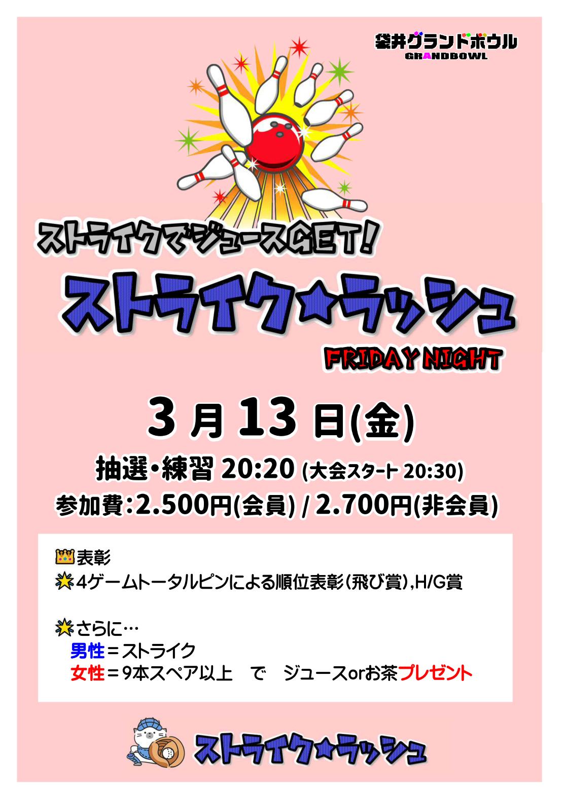 ◆表彰:①順位表彰(飛び賞)②スクラッチH/G賞③ストライク賞(男性はストライク、女性はストライクまたは9本スペアでジュースorお茶をプレゼント)