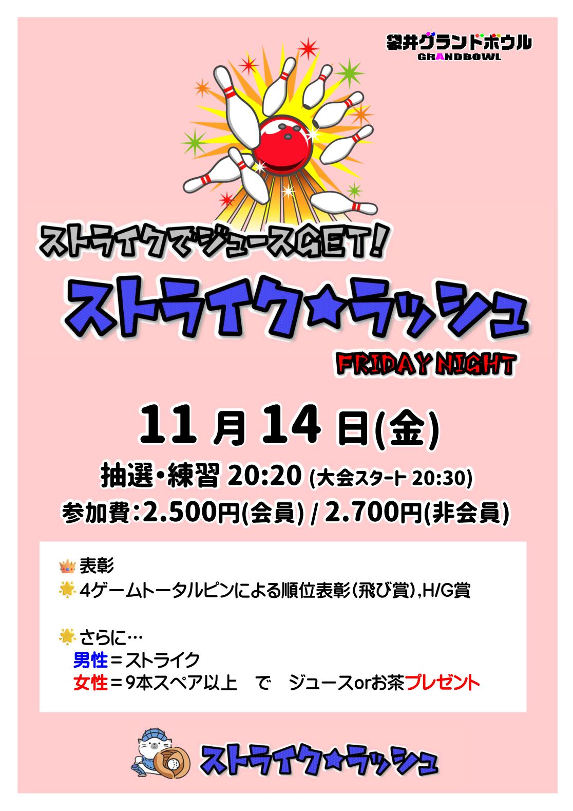 ◆表彰:①順位表彰(飛び賞)②スクラッチH/G賞③ストライク賞(男性はストライク、女性はストライクまたは9本スペアでジュースorお茶をプレゼント)