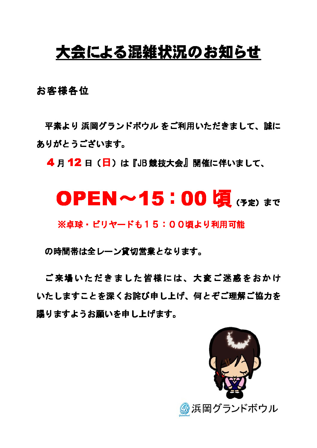 2026年4月12日(日)「競技大会開催に伴う営業のご案内」
