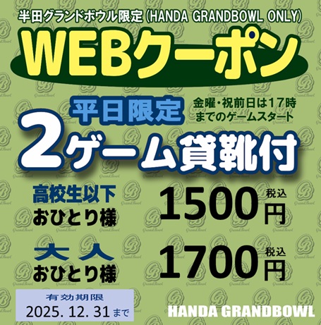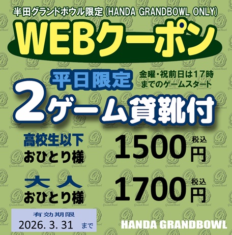 ●本券は半田グランドボウルのみ有効となります。●他券との併用はできません。●上記金額は大会及びご予約等にはご利用できません。●ご利用の際はこちらの画面をご提示ください。