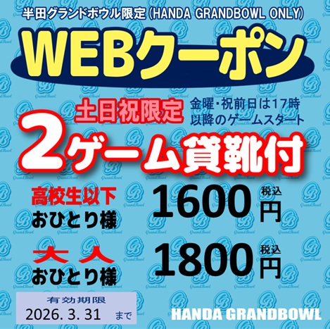 ●上記金額は大会及びご予約等にはご利用できません。●他券との併用はできません。●ご利用の際はこちらの画面をご提示ください。●本券は半田グランドボウルのみ有効となります。