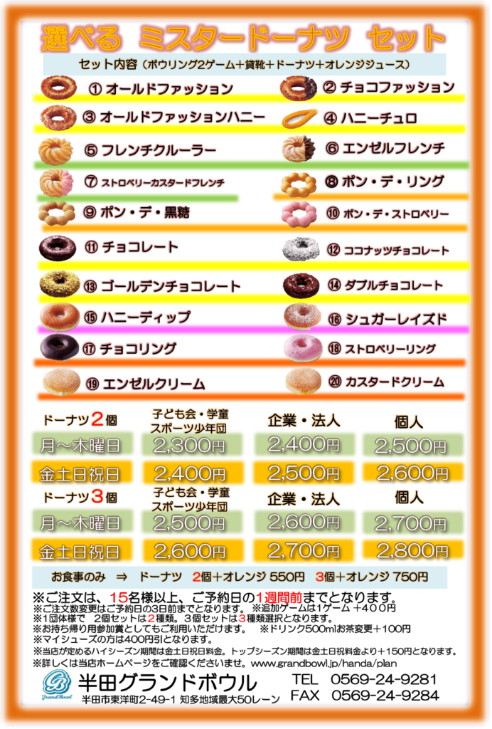 ※料金に関しましては、各団体プランのドーナツ&ボウリングセットをご参照ください。