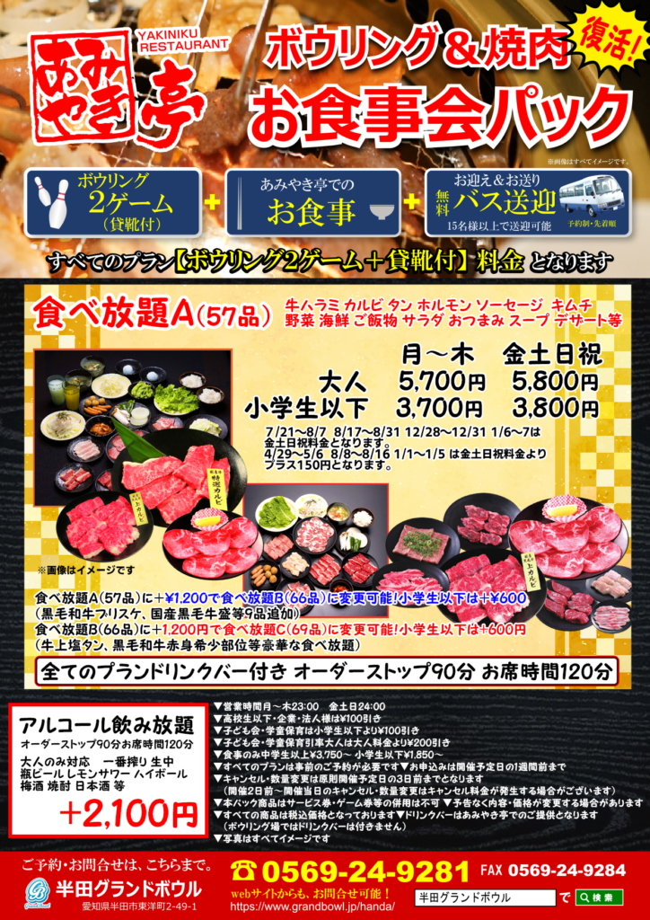 あみやき亭の焼肉食べ放題と、半田グランドボウルでのボウリング2ゲーム+貸し靴がセットになった、お得な予約プランです。