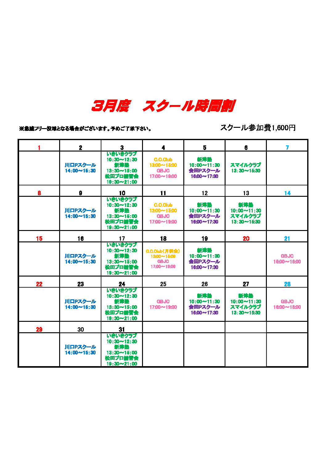 スクール費は1,600円で、開始30分前からフロントにて受付を行います!!