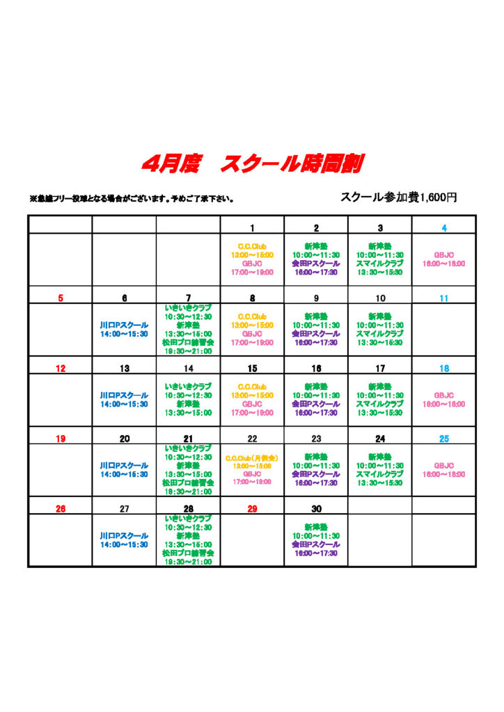 スクール費は1,600円で、開始30分前からフロントにて受付を行います!!