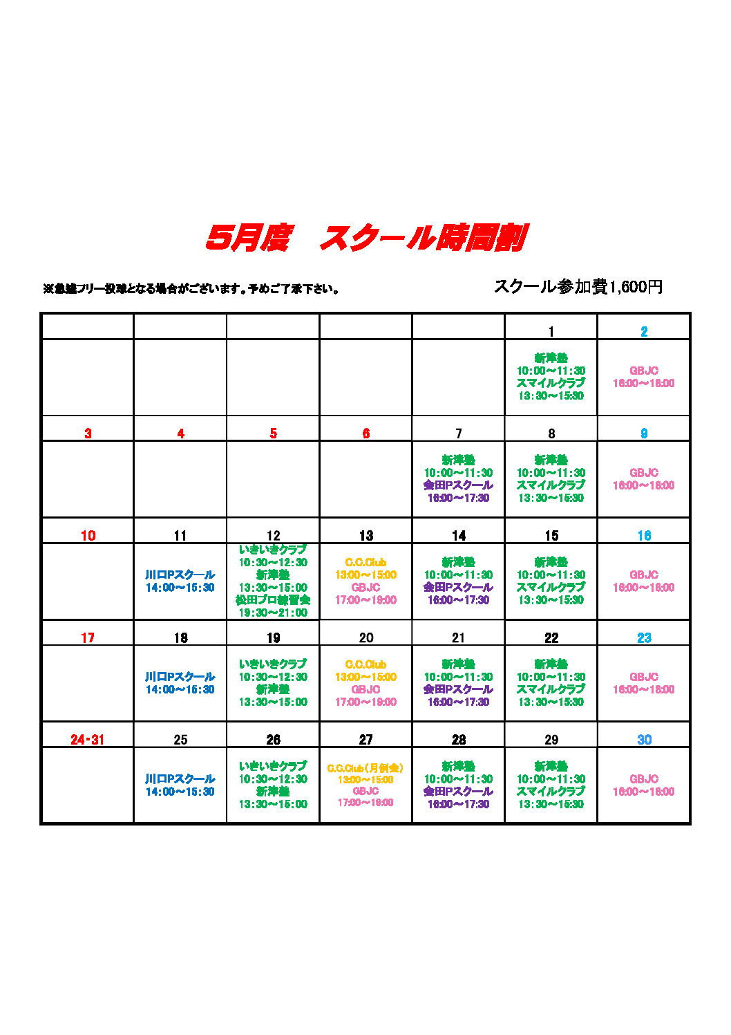 スクール費は1,600円で、開始30分前からフロントにて受付を行います!!