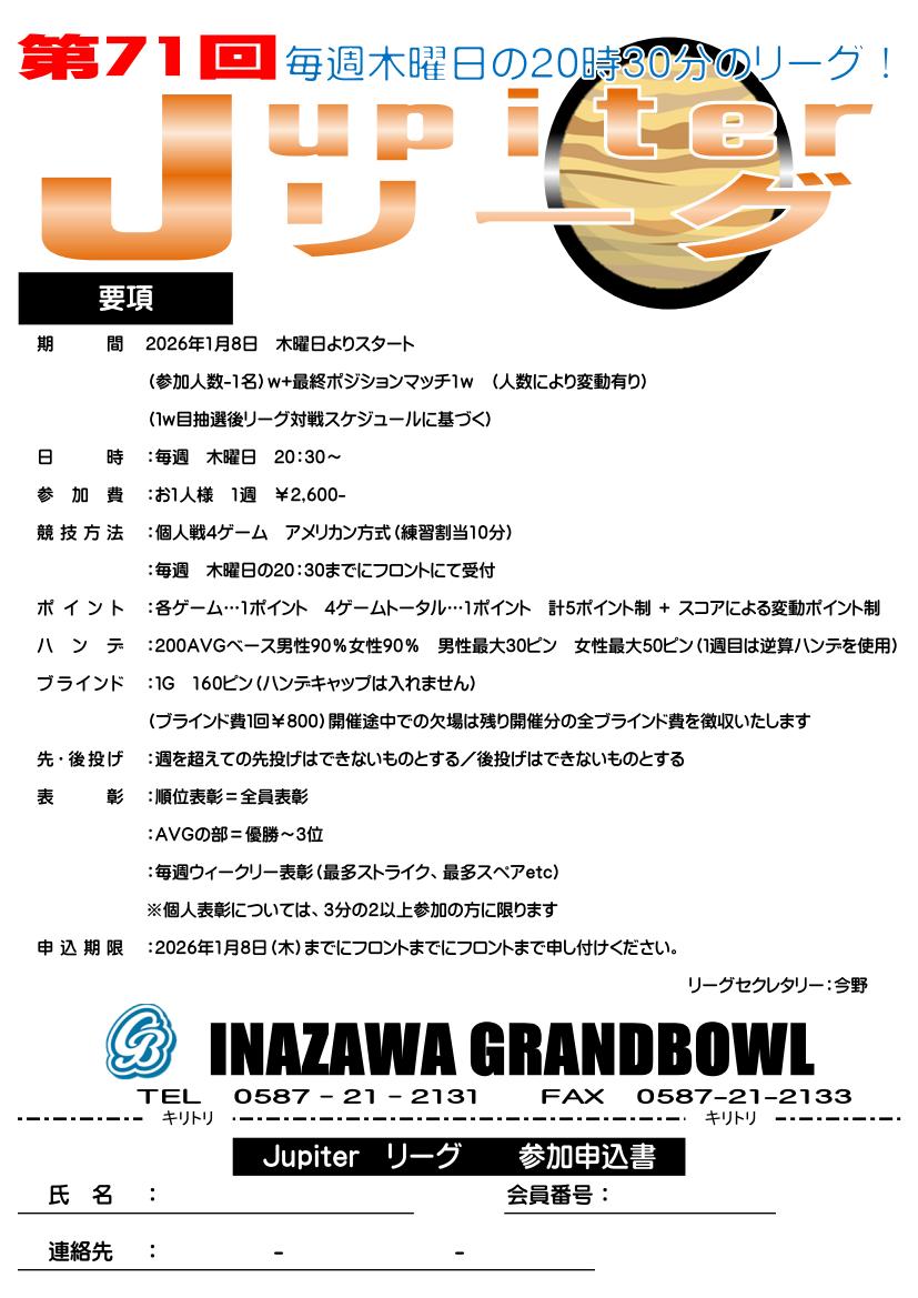 2026年1月8日(木)より第71回Jupiterリーグがスタートします。
