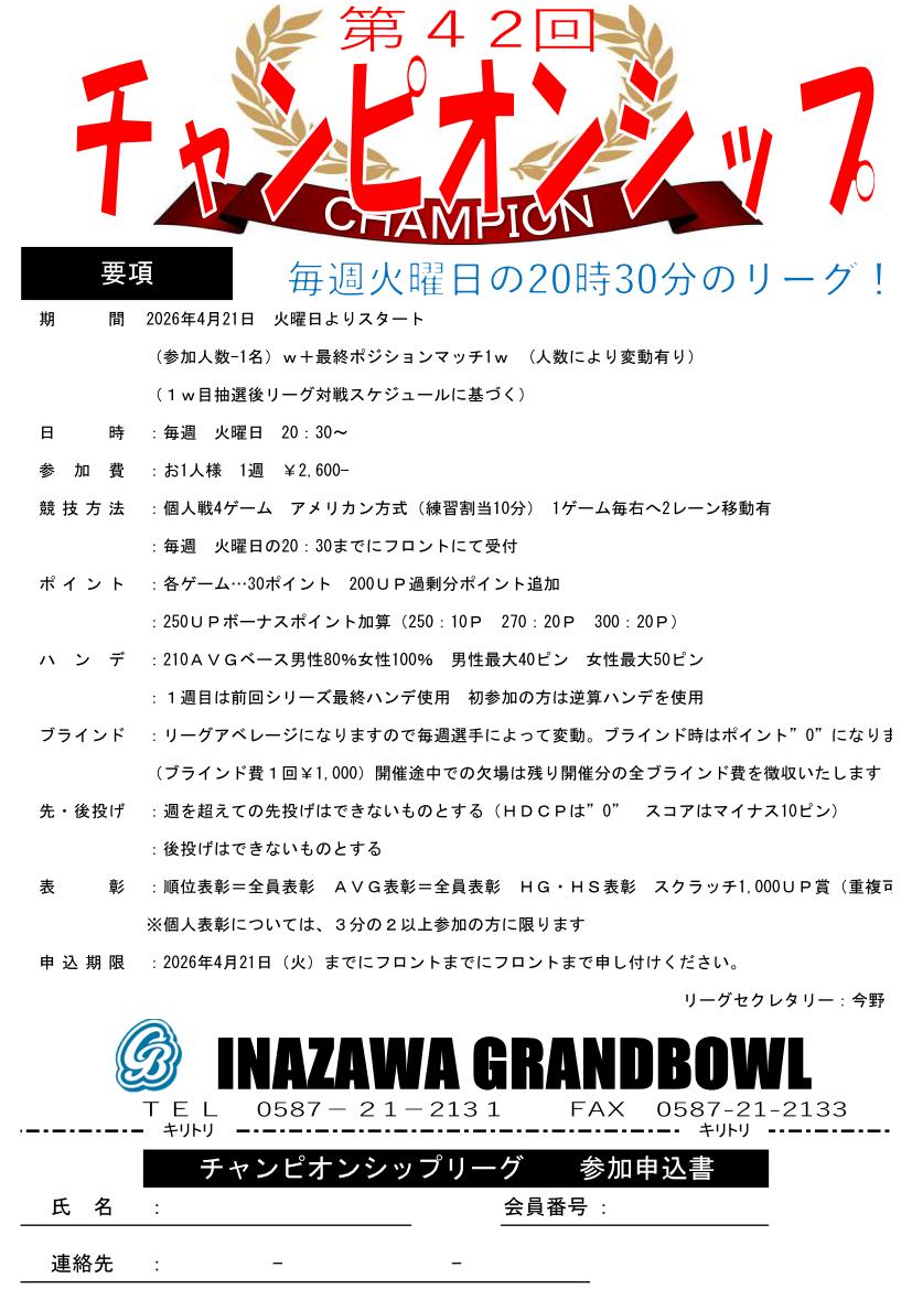 2026年4月21日(火)より第42回チャンピオンシップリーグがスタートします。