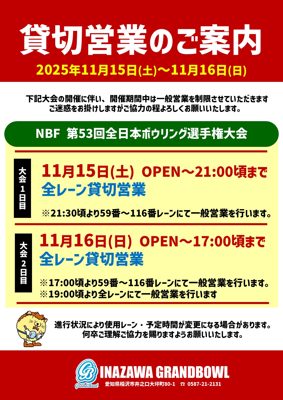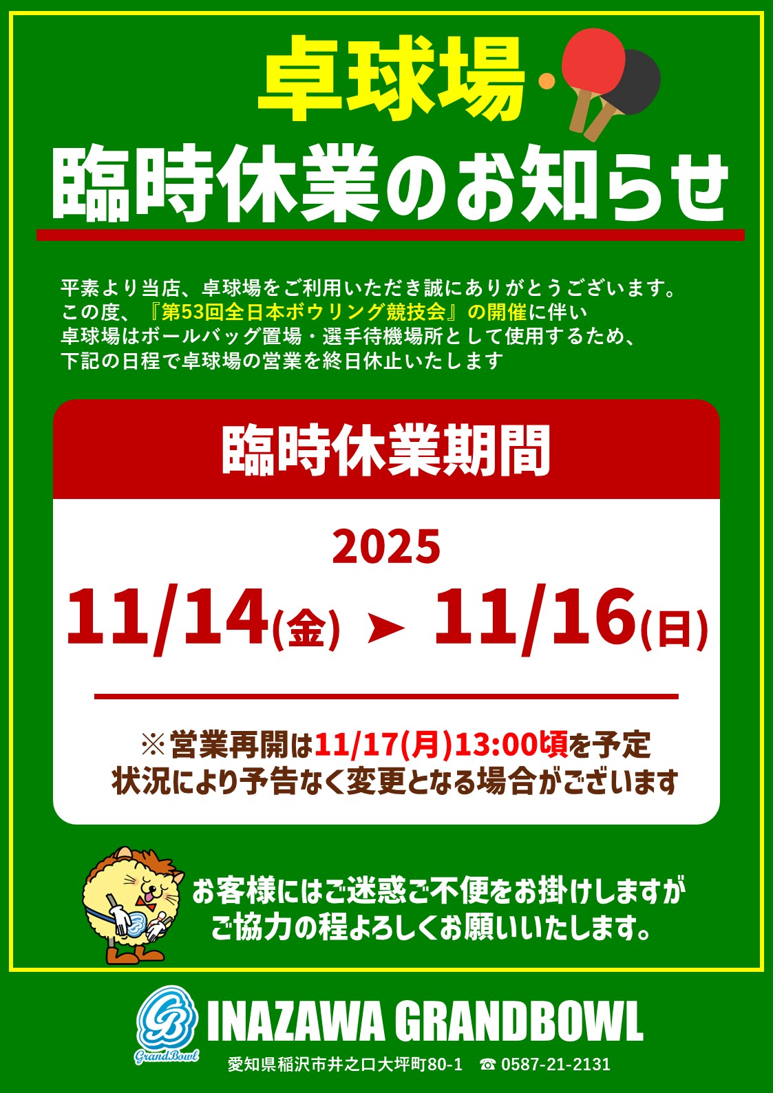 2025年11月15日(土)~10月16日(日)【競技会開催に伴う営業のご案内】