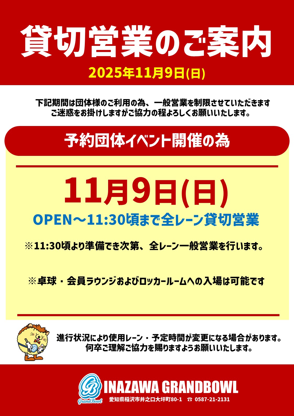 2025年11月9日(日)午前中のみ【予約イベントに伴う営業のご案内】