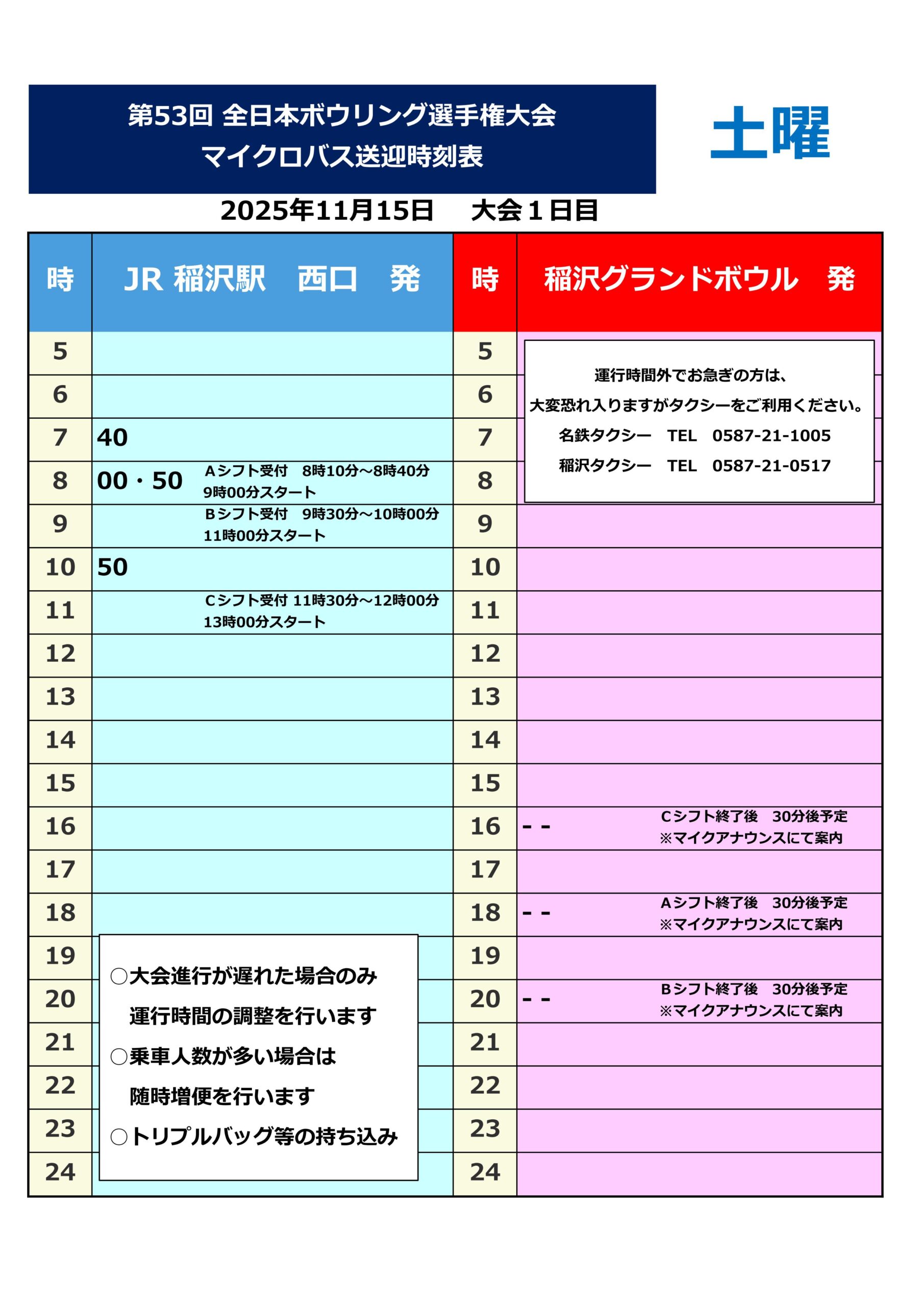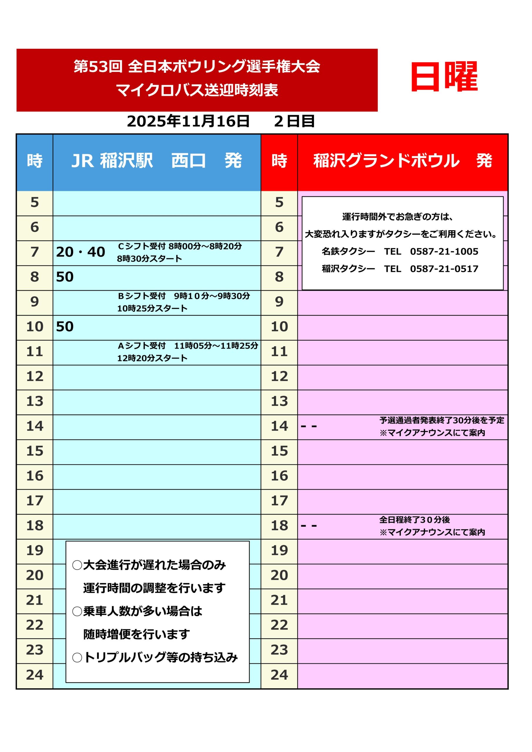 【マイクロバス送迎時刻表】NBF第53回全日本ボウリング選手権大会