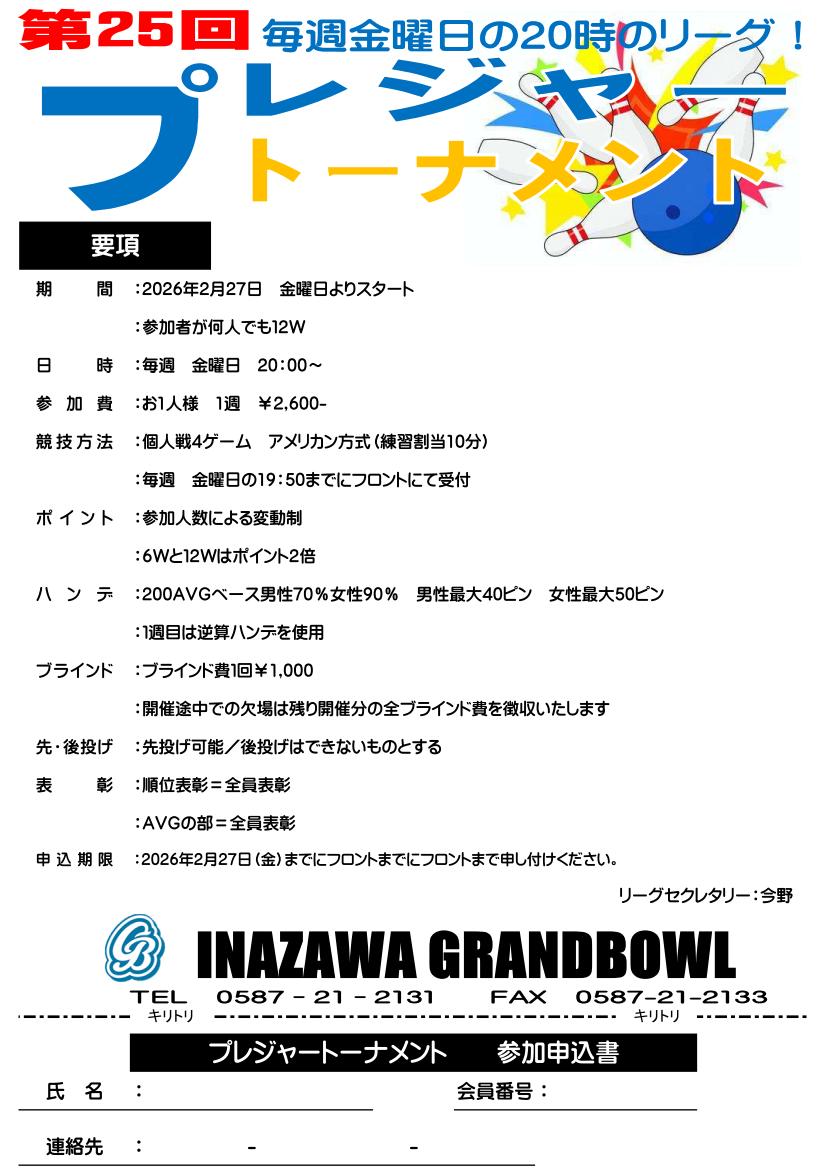 【リーグ新規参加者募集中】第25回プレジャートーナメント(2/27~) 2026年2月27日(金)より第25回プレジャートーナメントがスタートします。 第24回に参加された方はもちろん初参加の方も大歓迎です。 参加ご希望の方は2026年2月27日(金)までにフロントまで申し付けください。 たくさんのご参加お待ちしております。