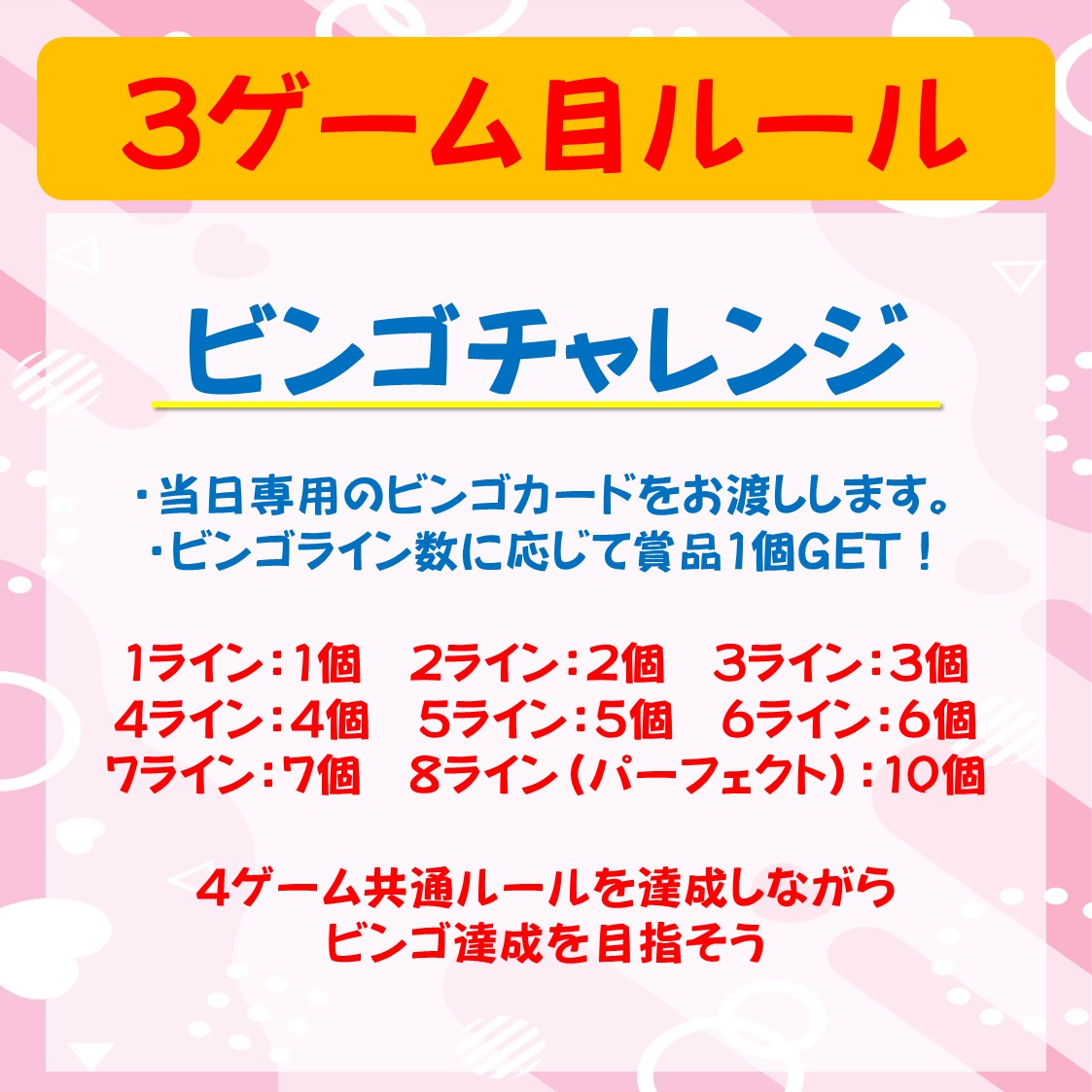 各ゲームのミッションをクリアしてお菓子やジュースをたくさんGETするイベントになっています。