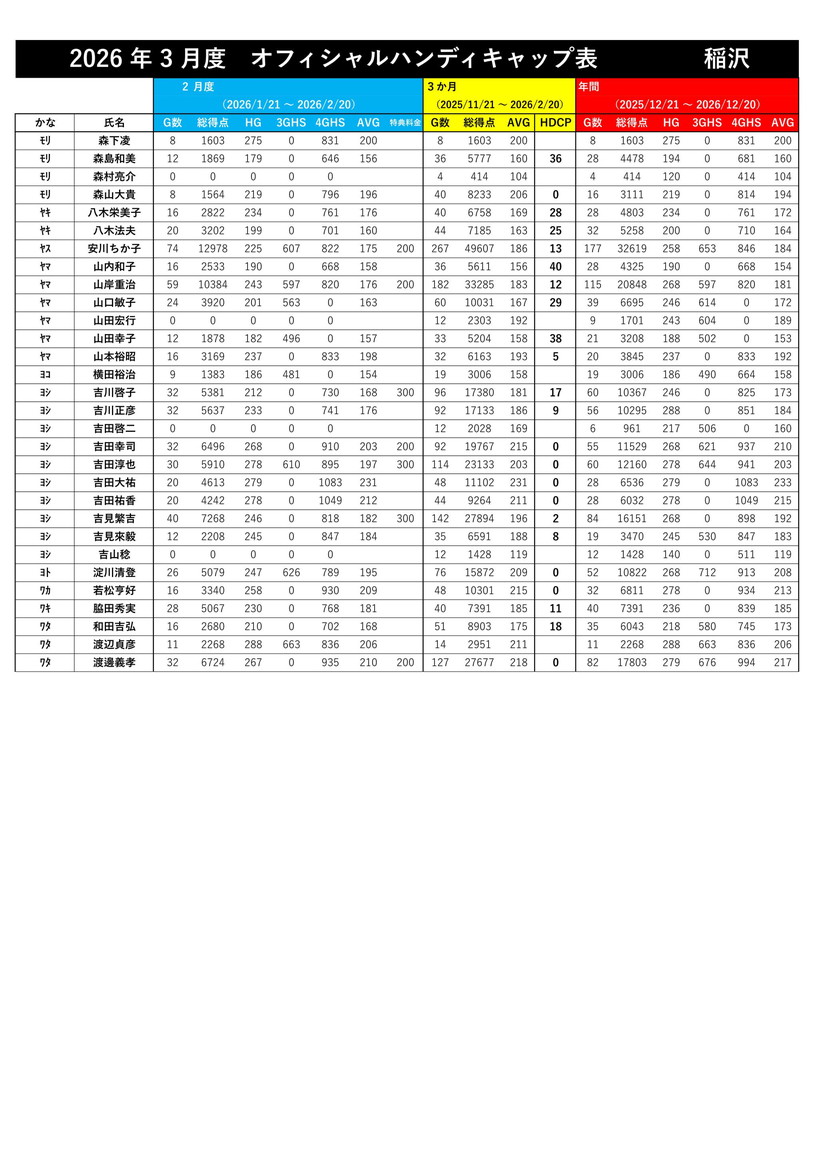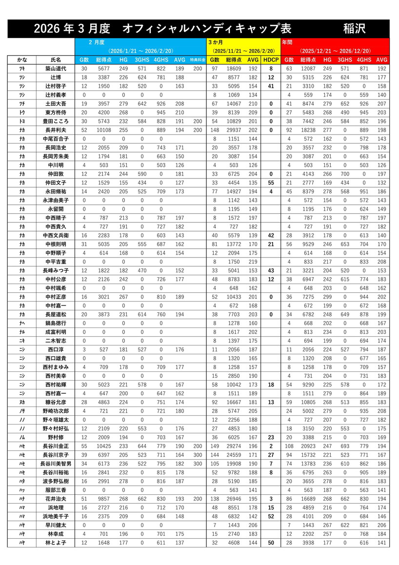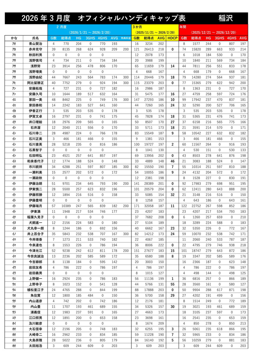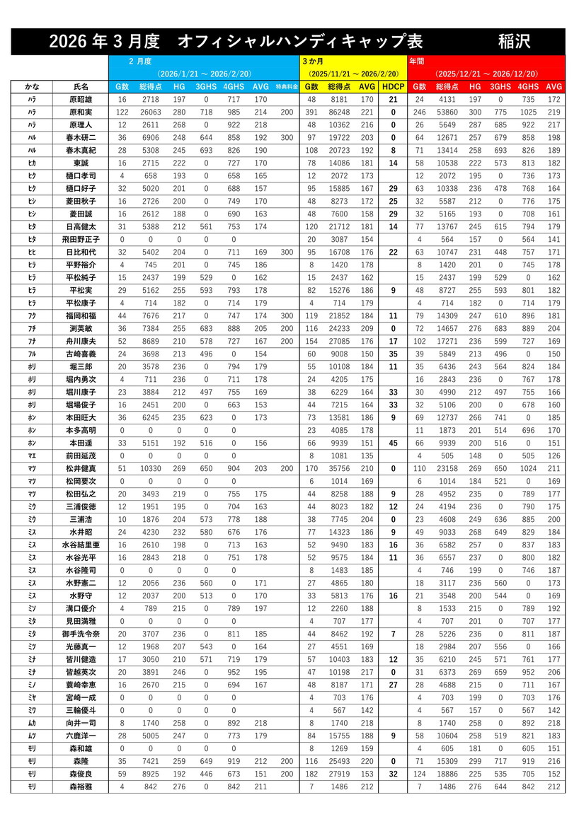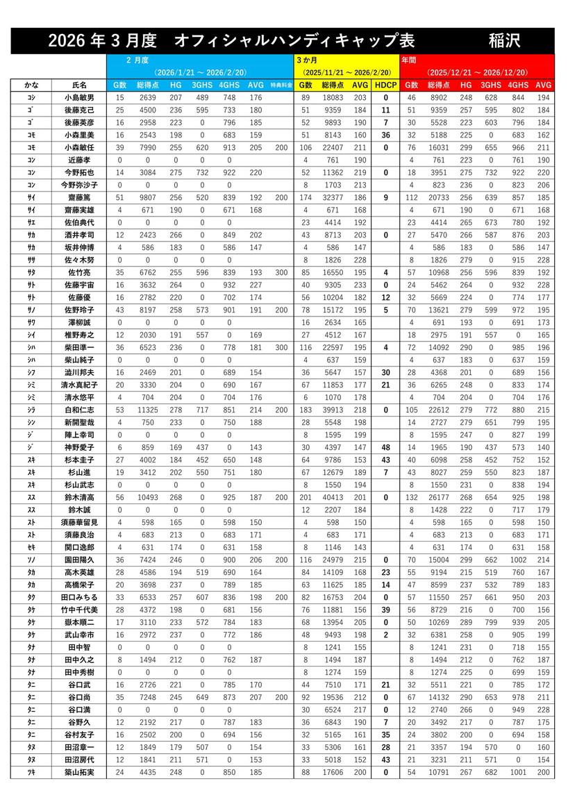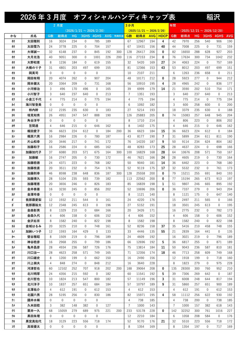 2026年1月21日~2026年2月20日までの公認ゲームアベレージの集計ができましたので掲載いたします。