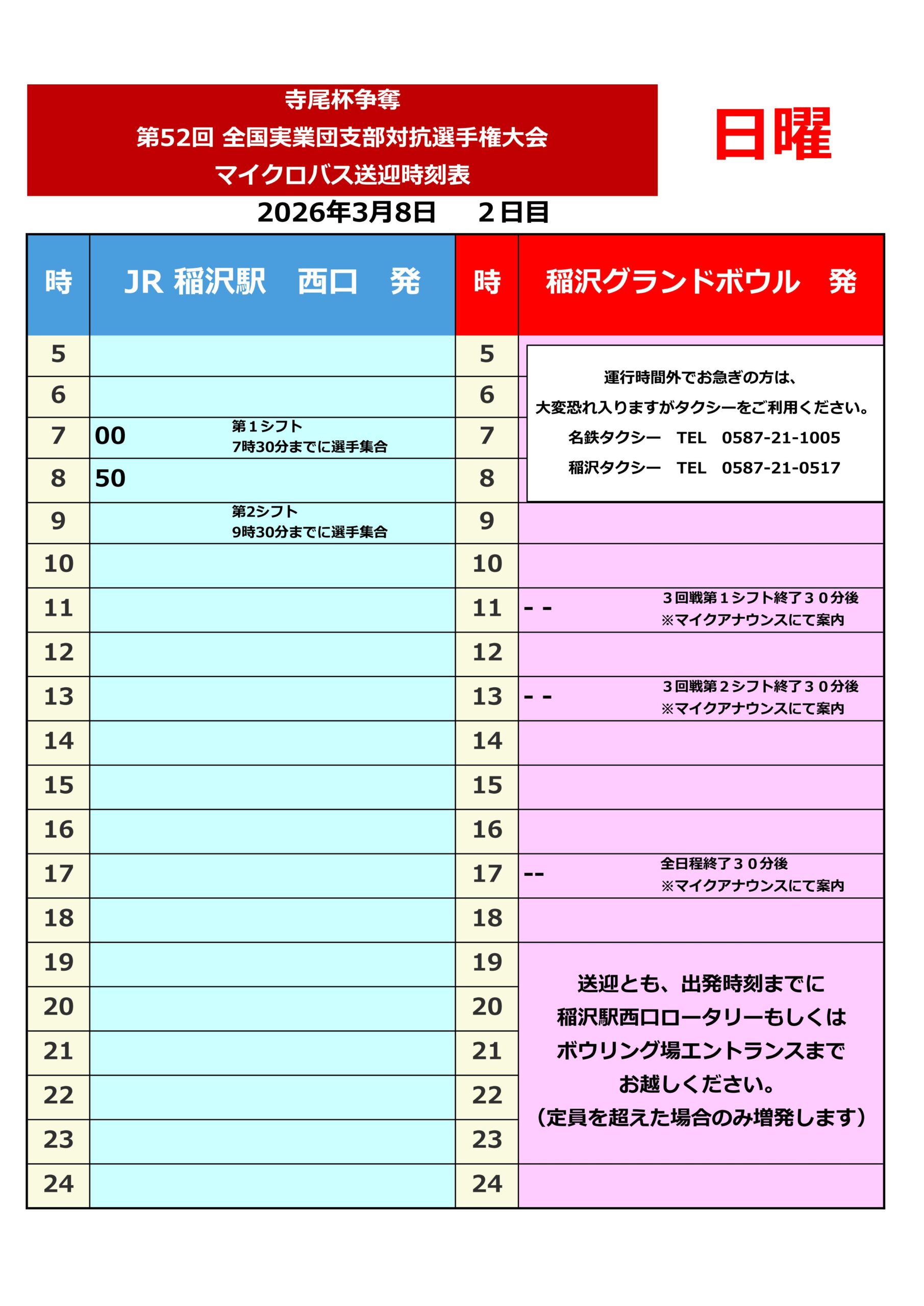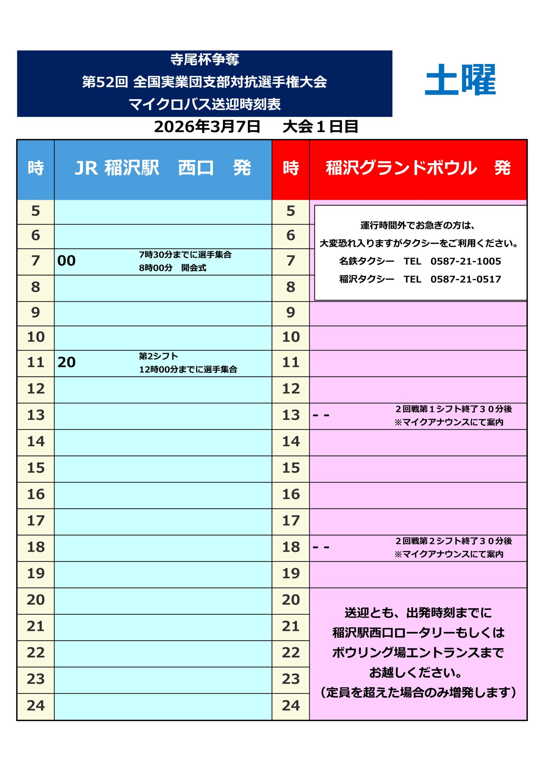 【マイクロバス送迎時刻表】ABBF第52回全国実業団支部対抗選手権大会