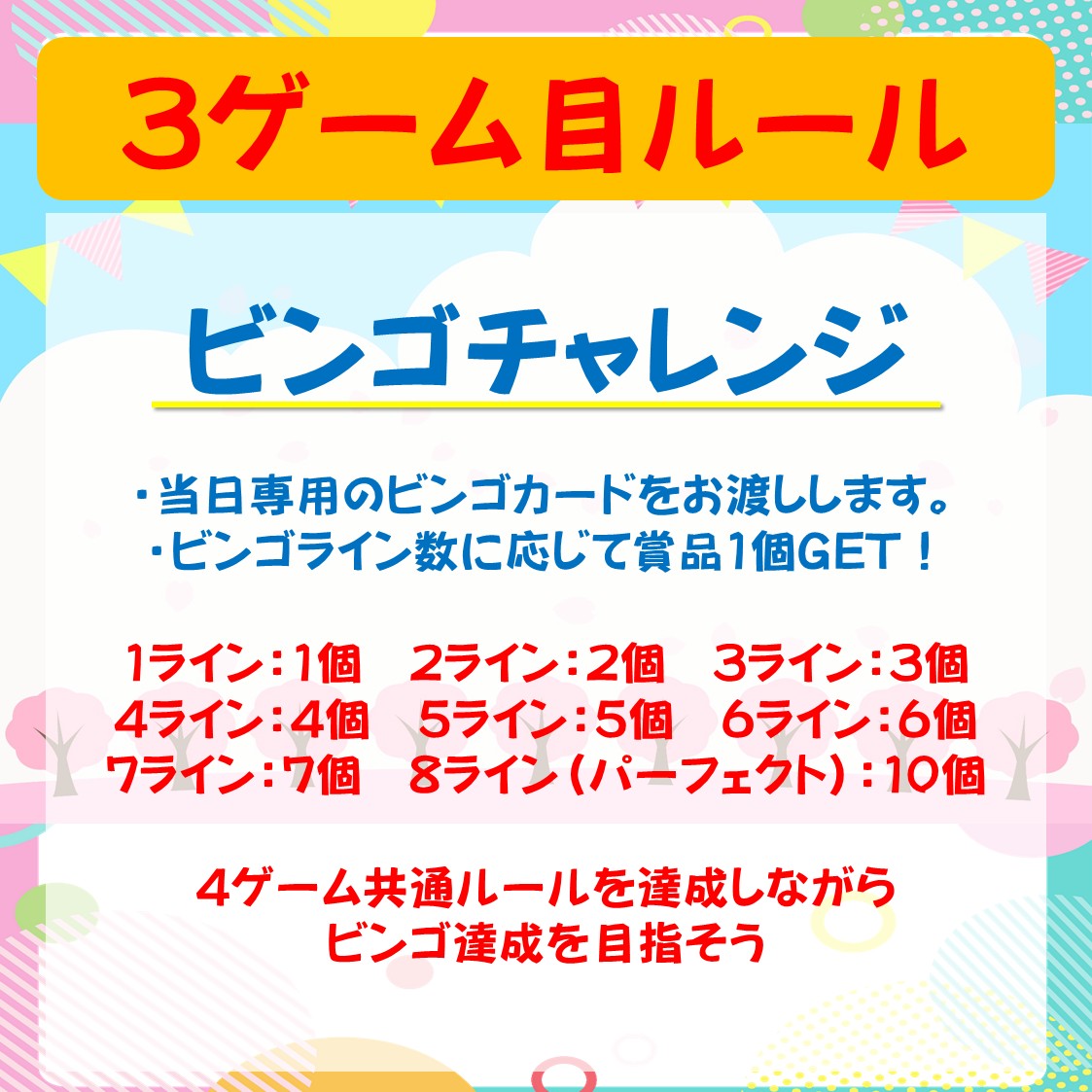 各ゲームのミッションをクリアしてお菓子やジュースをたくさんGETするイベントになっています。