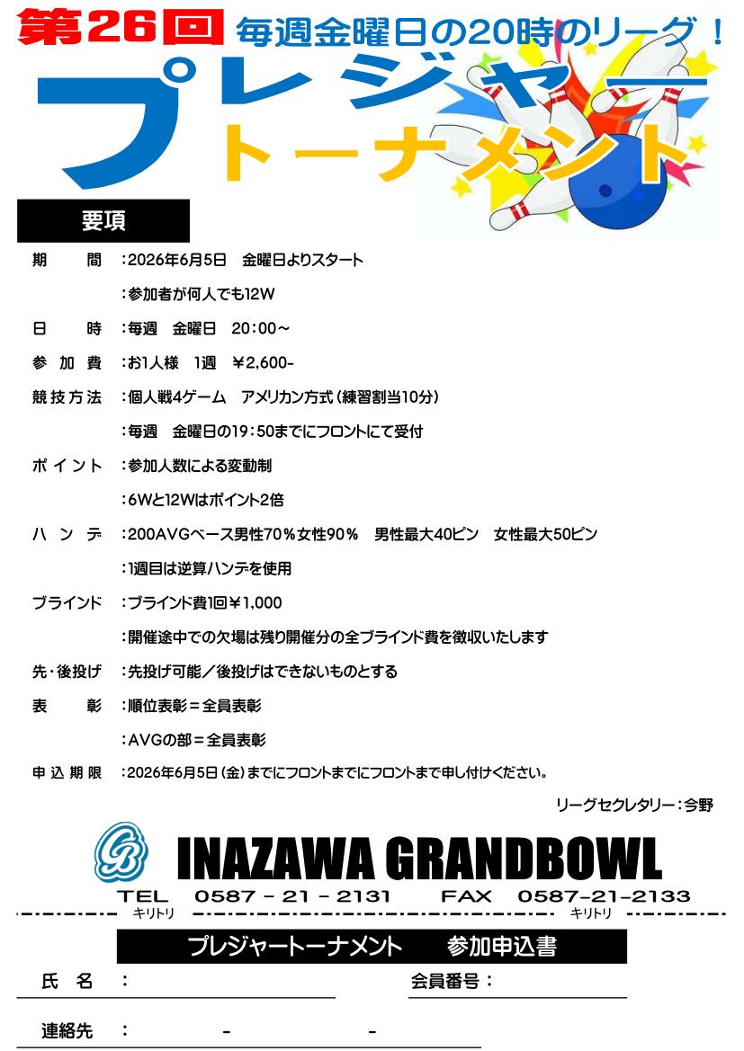 【リーグ新規参加者募集中】第26回プレジャートーナメント(6/5) 2026年6月5日(金)より第26回プレジャートーナメントがスタートします。 第25回に参加された方はもちろん初参加の方も大歓迎です。 参加ご希望の方は2026年6月5日(金)までにフロントまで申し付けください。 たくさんのご参加お待ちしております。