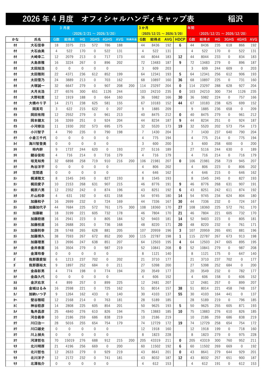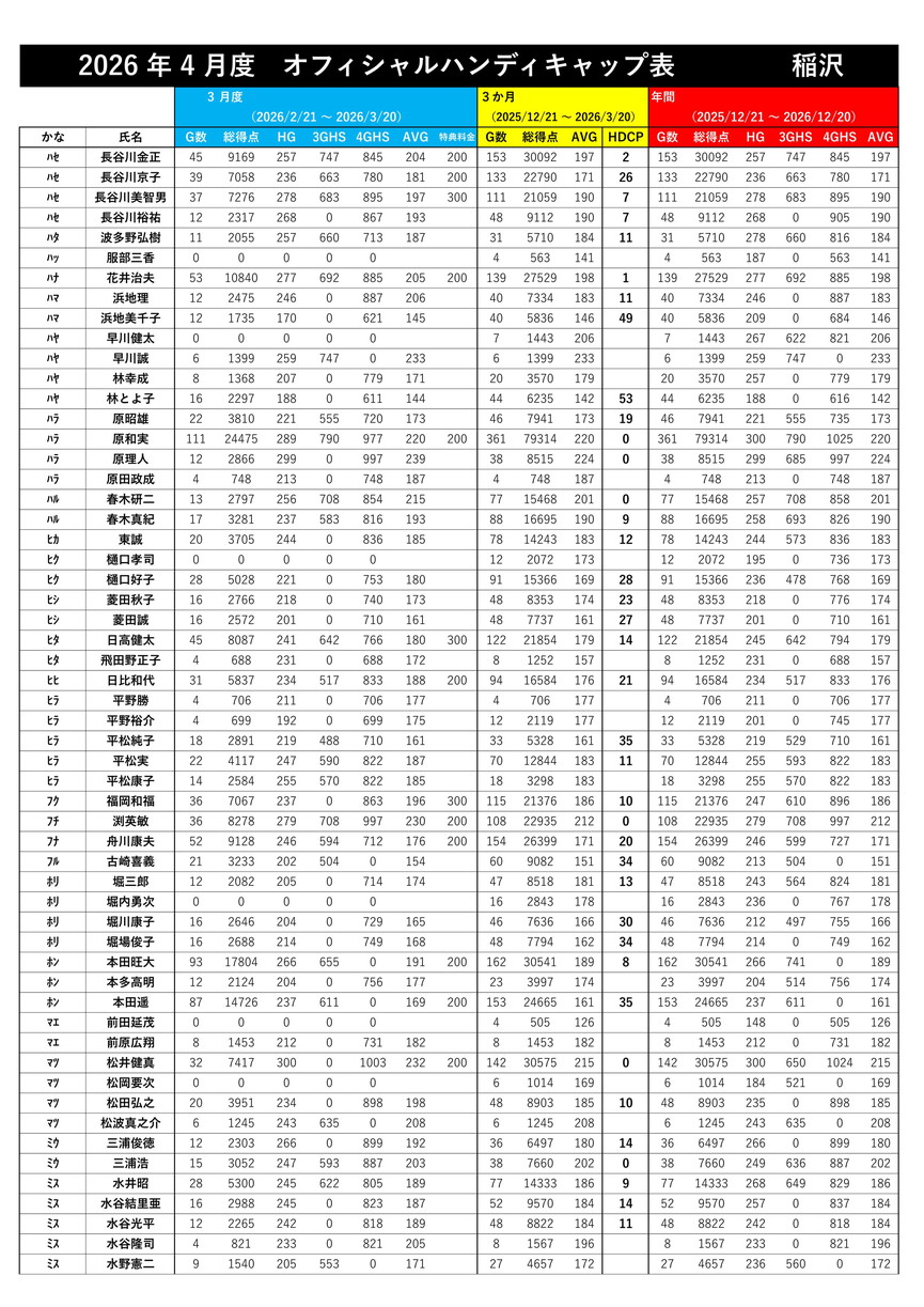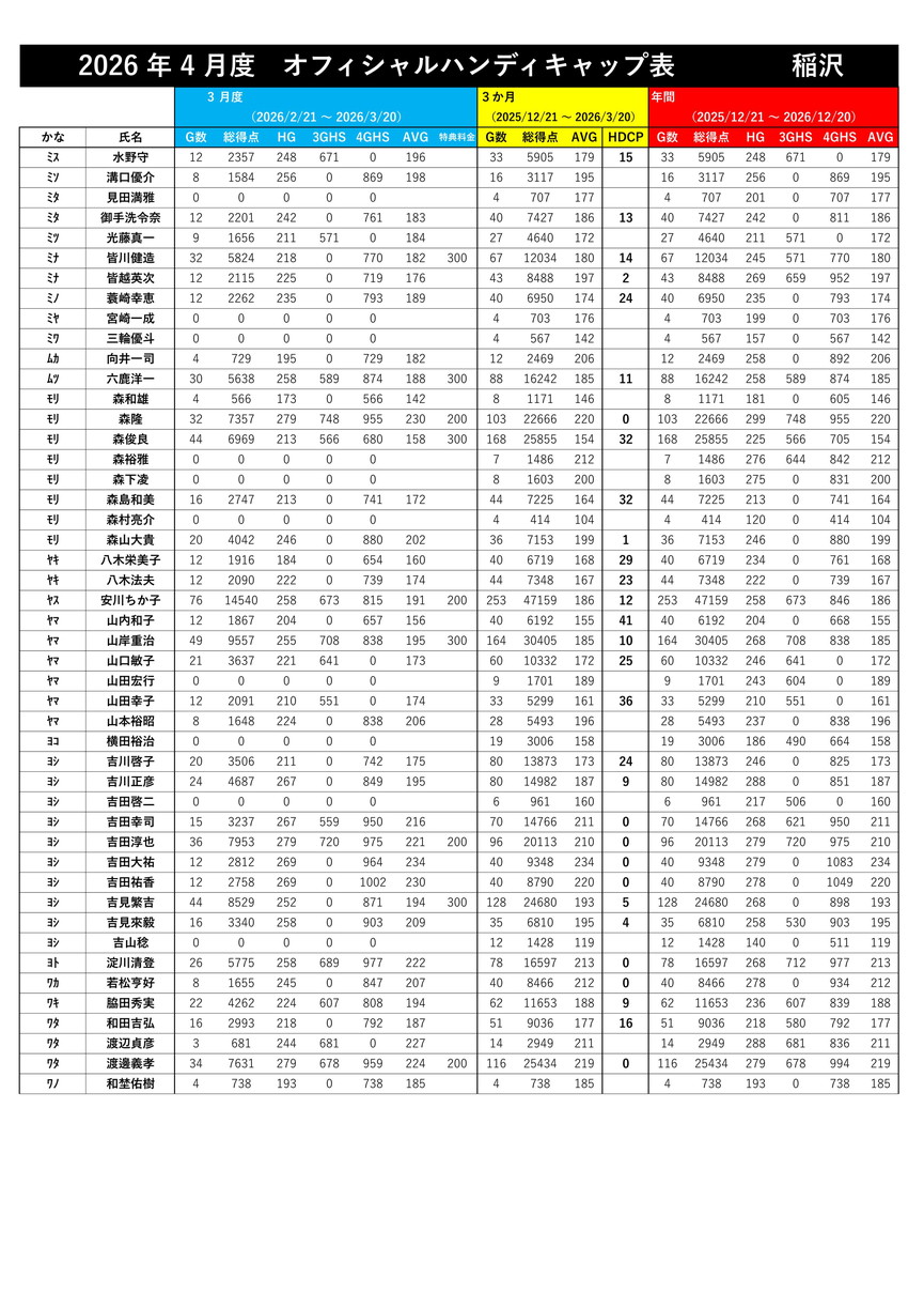 【2026年4月度オフィシャルハンディキャップ】