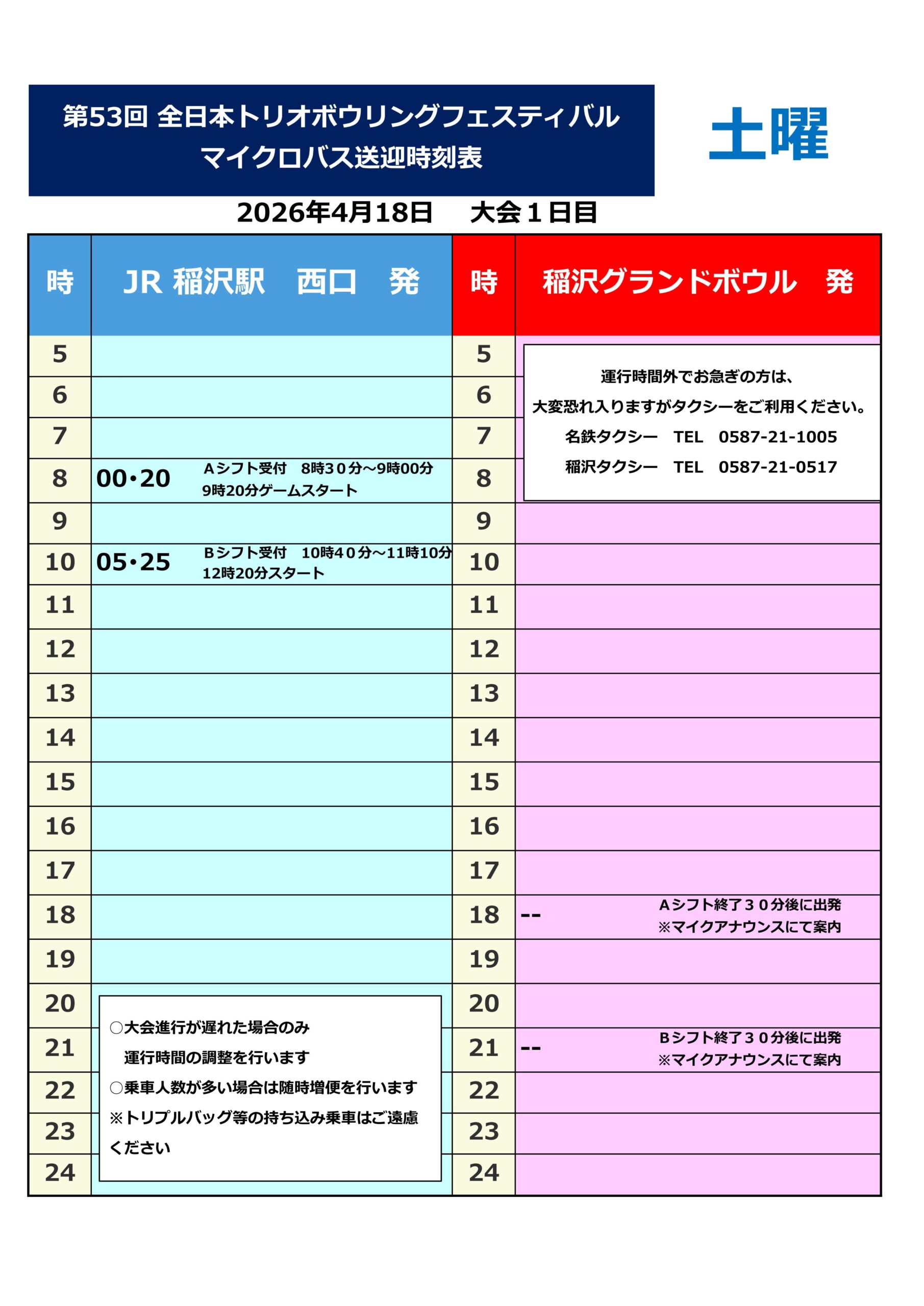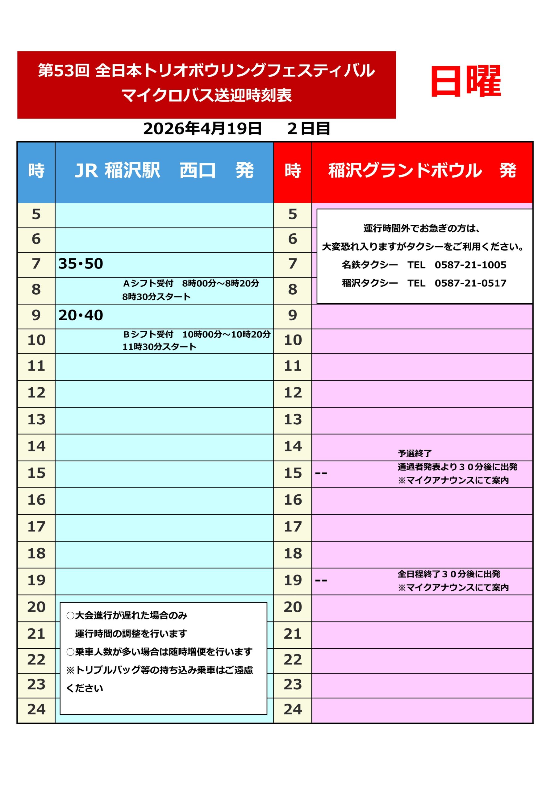 【マイクロバス送迎時刻表】NBF第53回全日本トリオボウリングフェスティバル