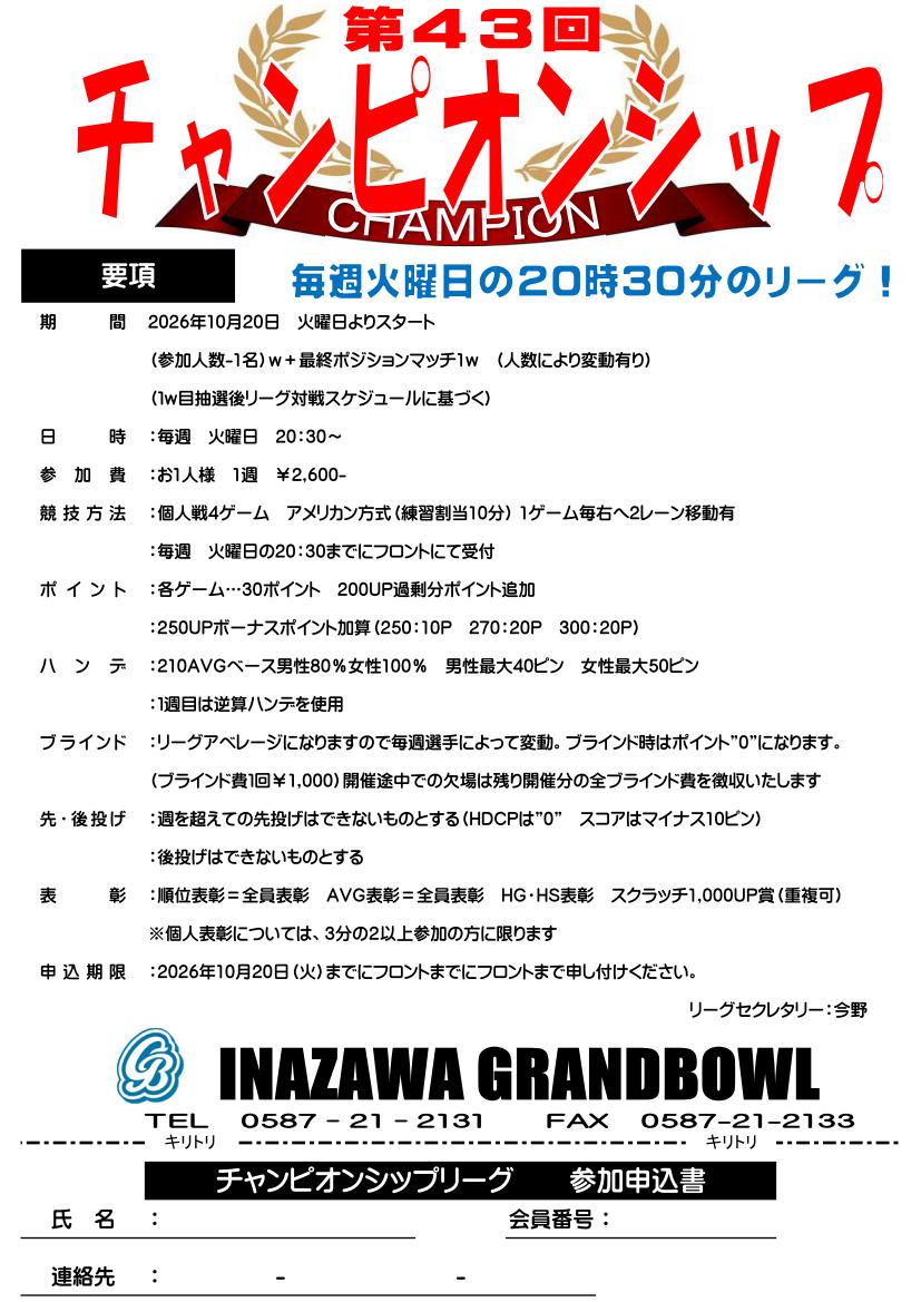 2026年10月20日(火)より第43回チャンピオンシップリーグがスタートします。