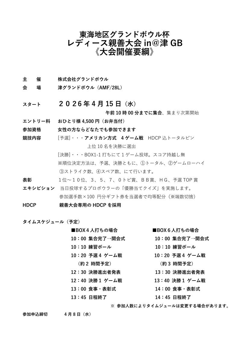 【2026年4月15日(水)レディース親善大会【津】】