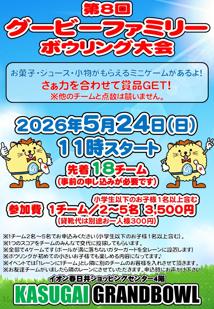 小学生以下のお子様1名以上を含む2~5名で1チーム。お子さまもマイボウラーも、どなたでも参加可能です ※全レーンにガターガードが設置された状態でプレイしていただきます