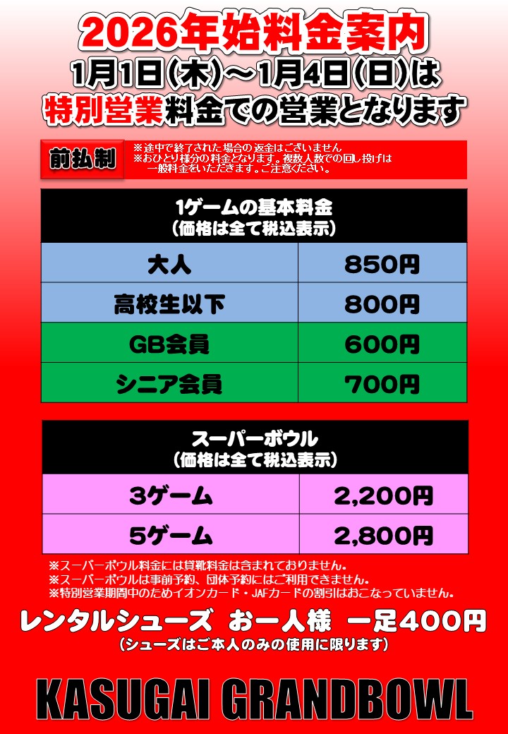 2026年1月1(木)~4日(日)は特別営業料金での営業になります。