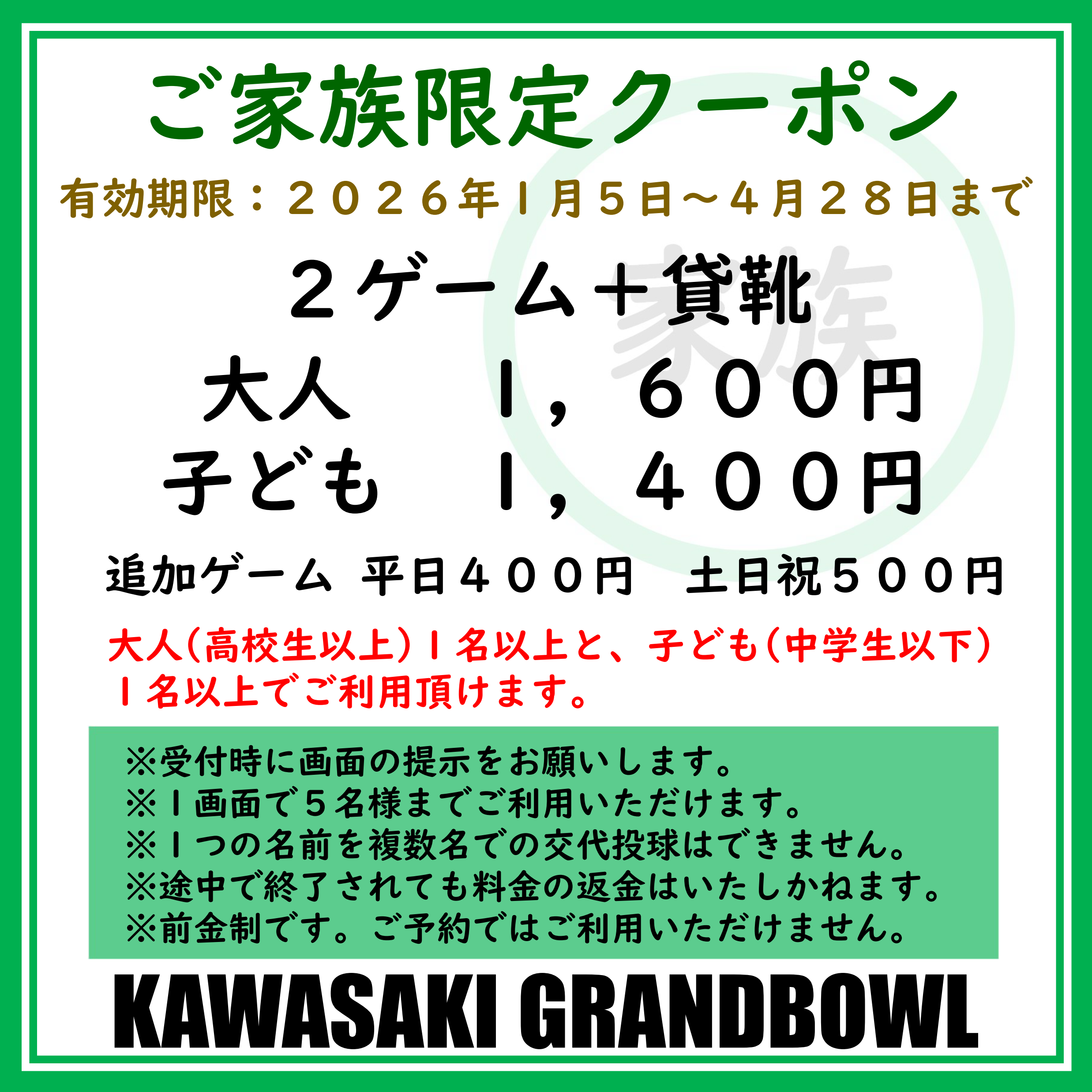 大人(高校生以上)1名以上と子供(中学生以下)1名以上でご利用いただけます。※ご家族(5名様まで)限定です