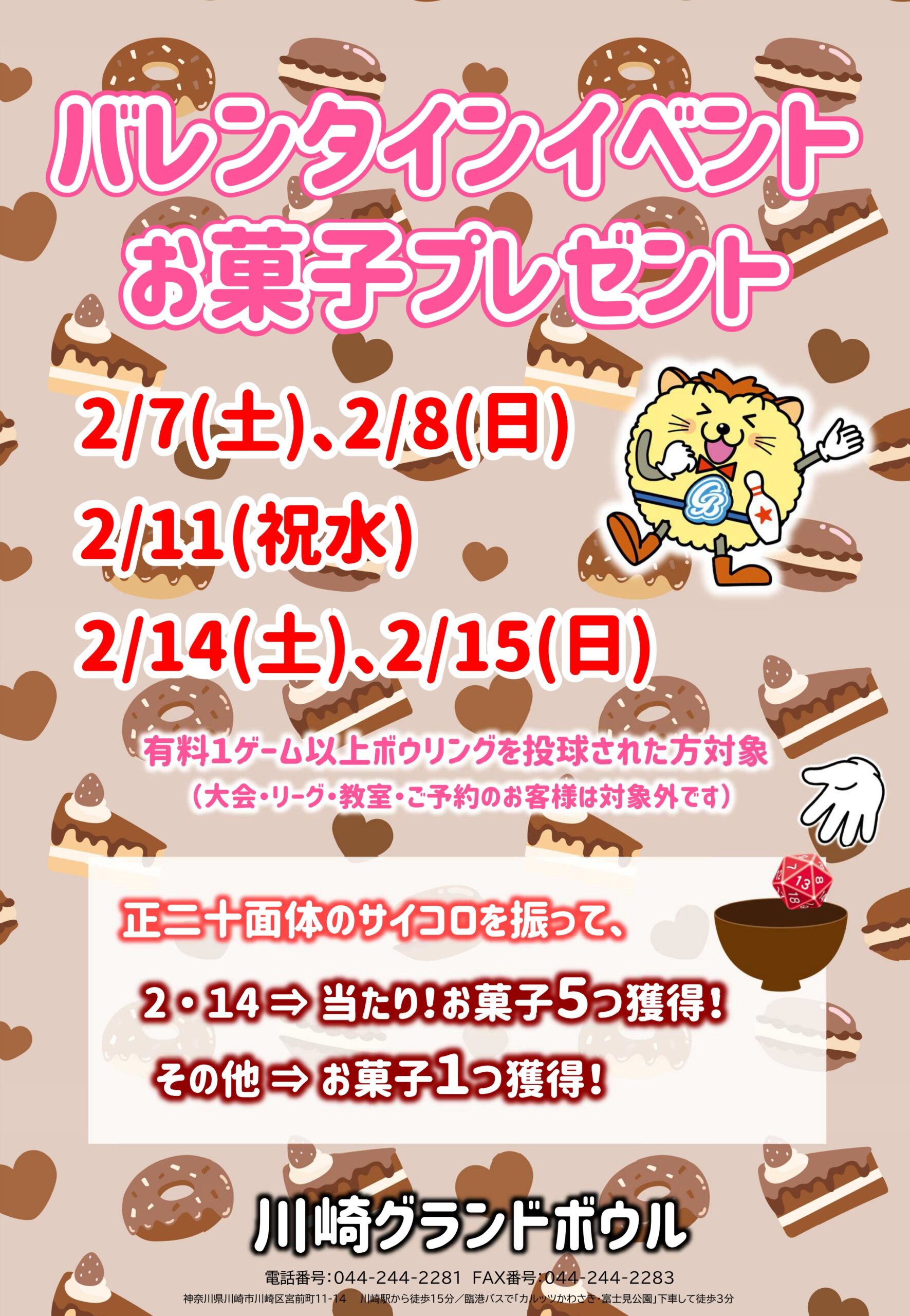 帰りに正二十面体のサイコロを振っていただき、2か14の目が出れば大当たり!それ以外でもお菓子を持ち帰れます♪(大会・リーグ・教室・ご予約のお客様は対象外なります)