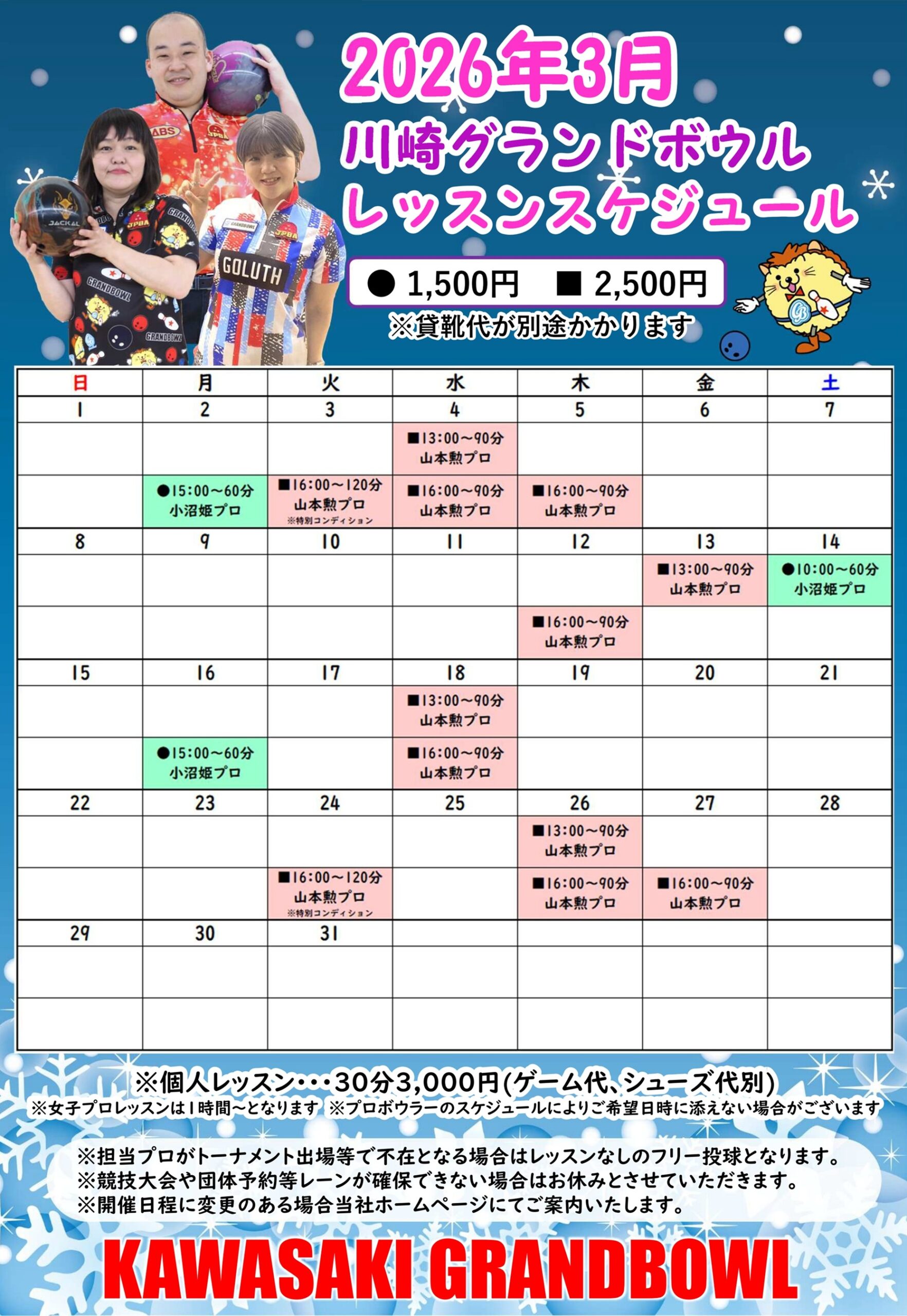 ※火曜日16時から開催の山本勲プロレッスンは、特殊コンディションを引いての練習会となり、中級者向けとなります。