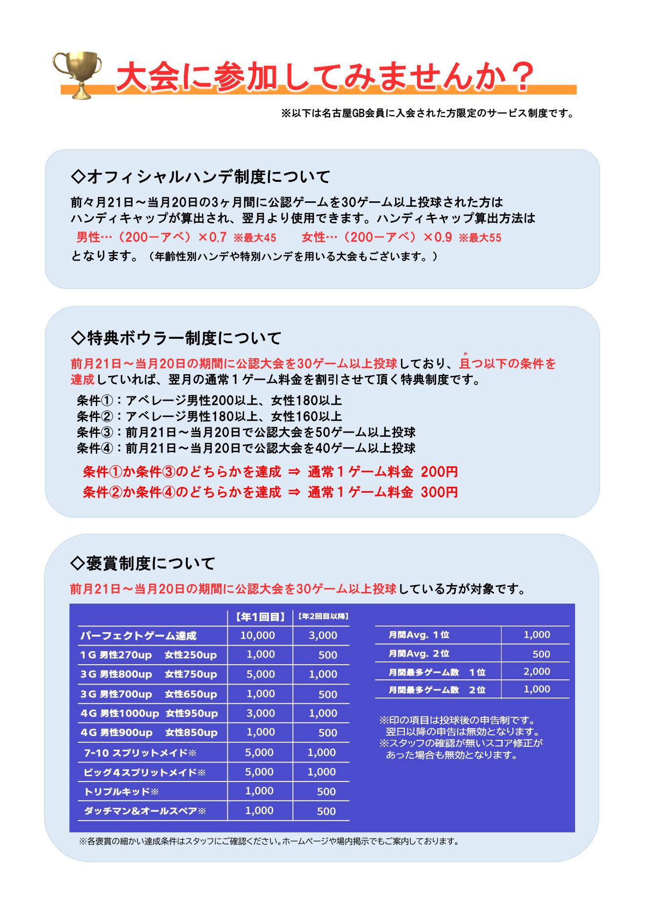 前々月21日~当月20日の期間に公認大会を30ゲーム投球された方はハンディキャップが算出され、翌月より使用できます。