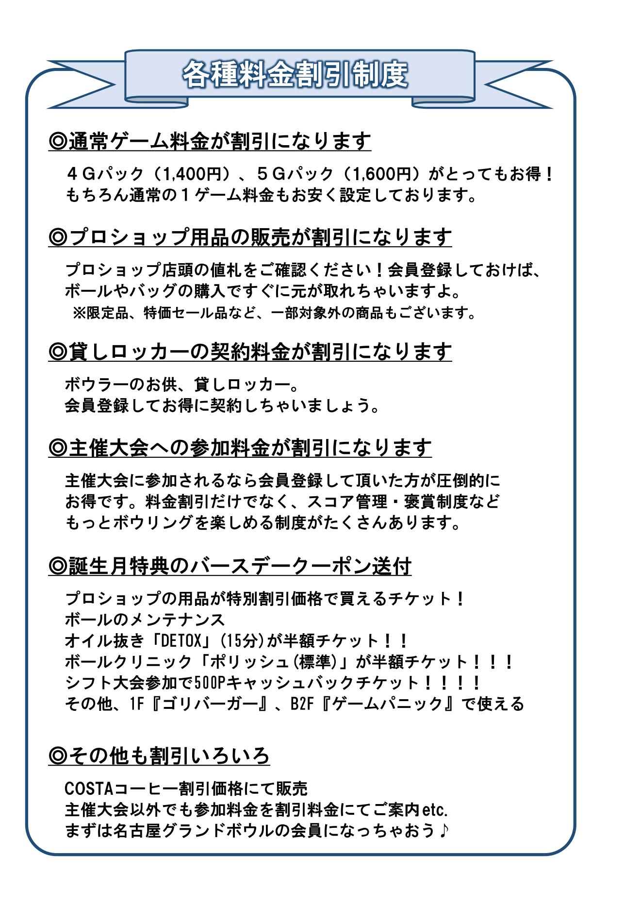 名古屋グランドボウルでは、ボウリングをもっと楽しんで頂けるように、数多くの特典がある会員制度を用意しております。少しでもボウリングにのめり込むなら!!ゲーム代も物品購入も断然お値打ちな名古屋グランドボウル会員へのご入会をオススメします♪