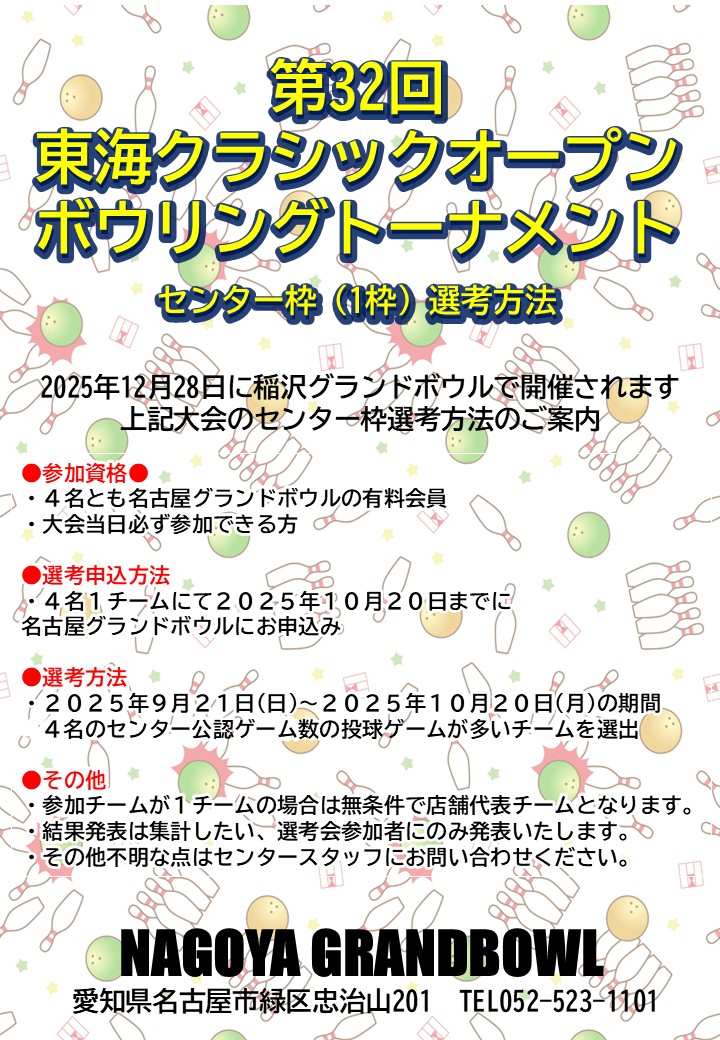 名古屋グランドボウルのセンター代表枠が1枠ございます。