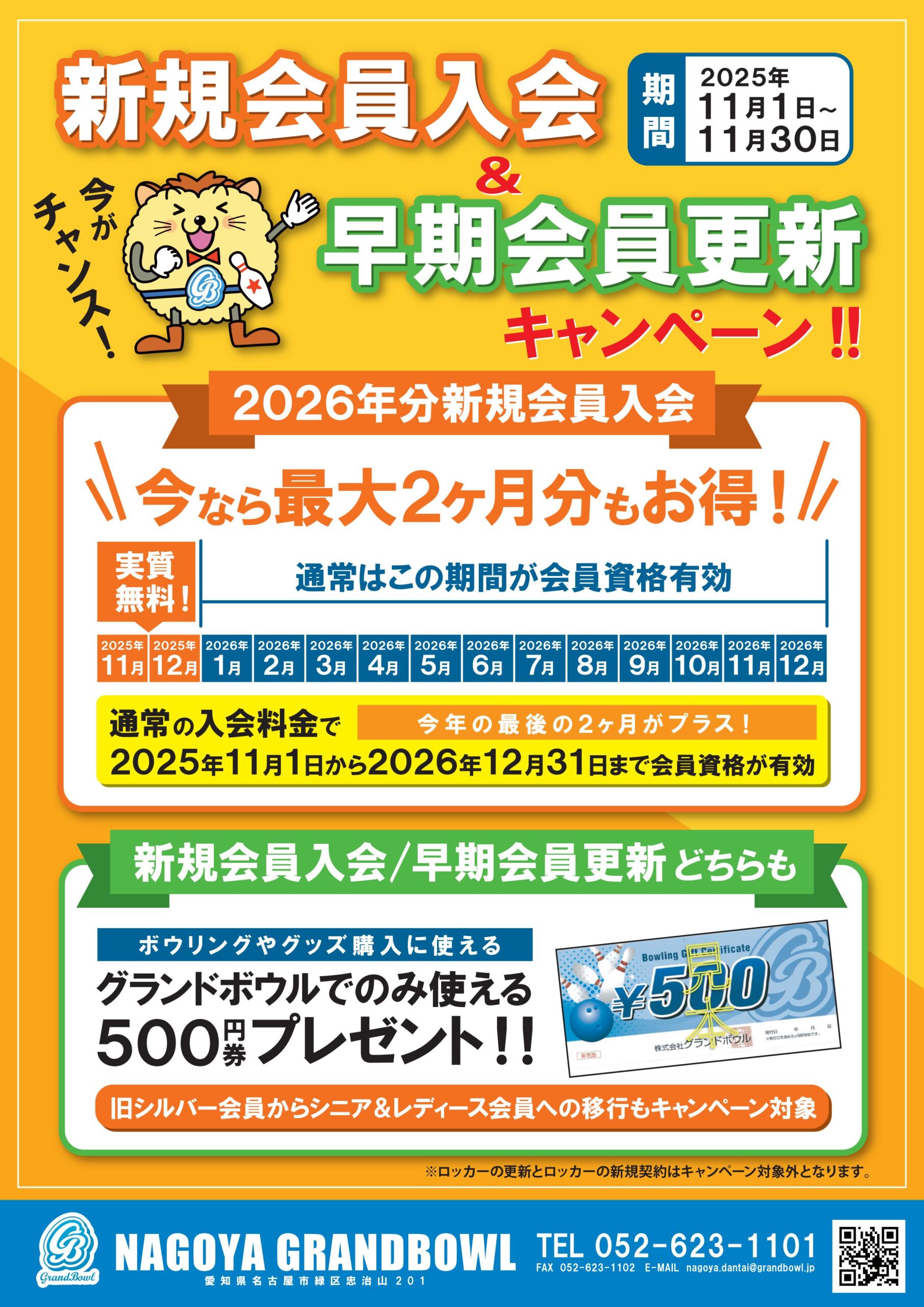 【内 容】開催期間に2026年度 新規会員登録・早期会員更新を行ったお客様全員にグランドボウルで使用できる500円券をプレゼント致します!※旧シルバー会員からシニア&レディース会員への移行もキャンペーン対象です。※ロッカー更新、ロッカー新規契約はキャンペーン対象外です。