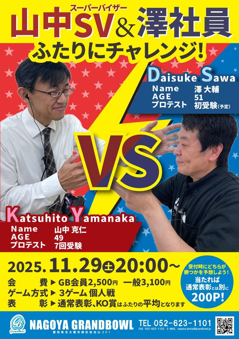 【イベント】 山中SV・澤社員のふたりにボウリング3Gの勝負をしてもらいます。参加者はどちらが勝つかを予想してもらい、見事的中した方には通常表彰とは別に200Pを進呈いたします