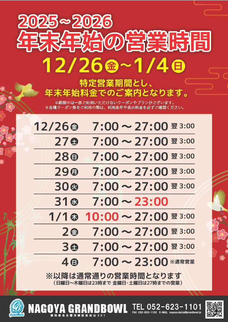 2025年-2026年 年末年始のボウリング料金表