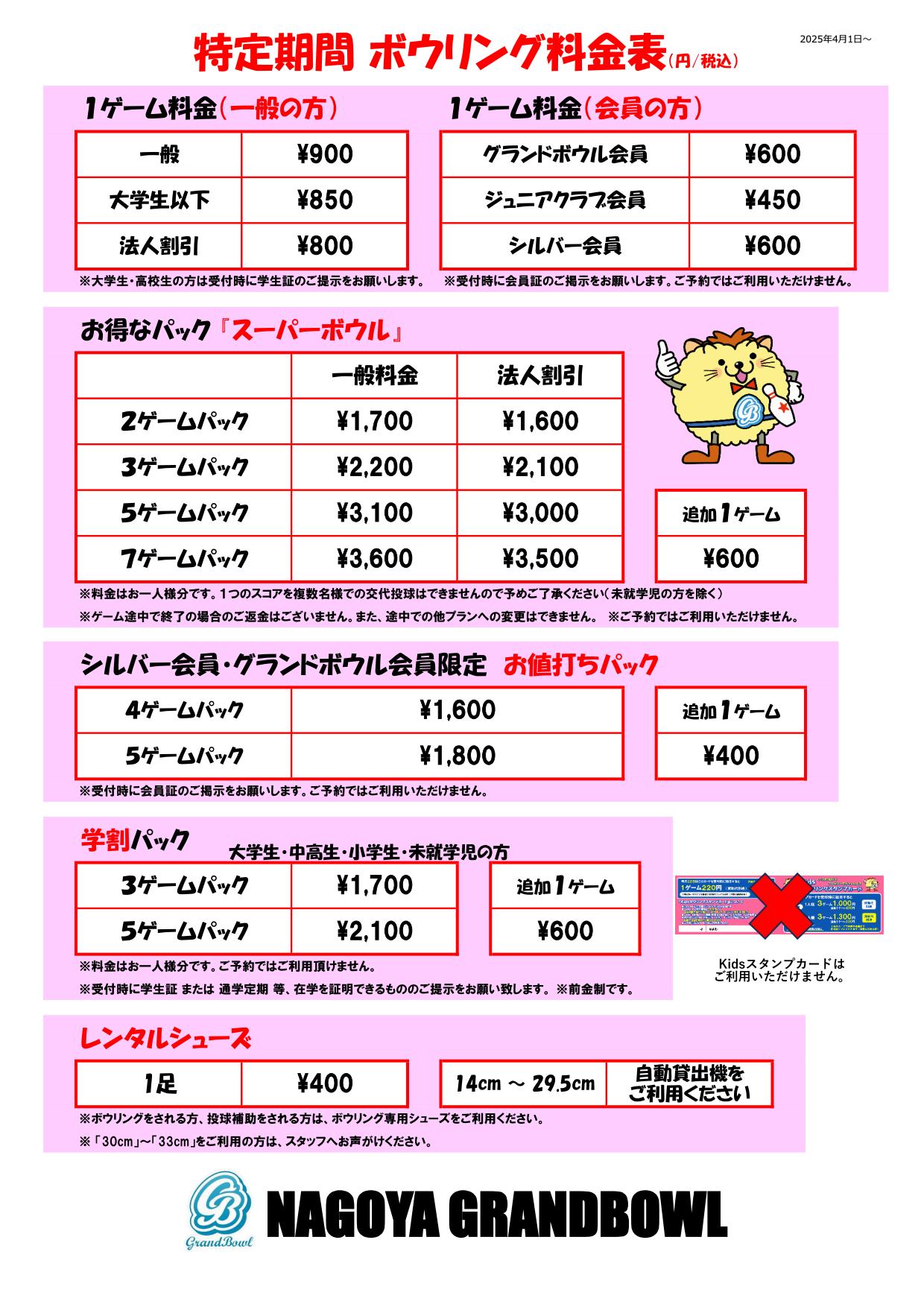 特定営業期間とし、下記に掲載したボウリング料金となります