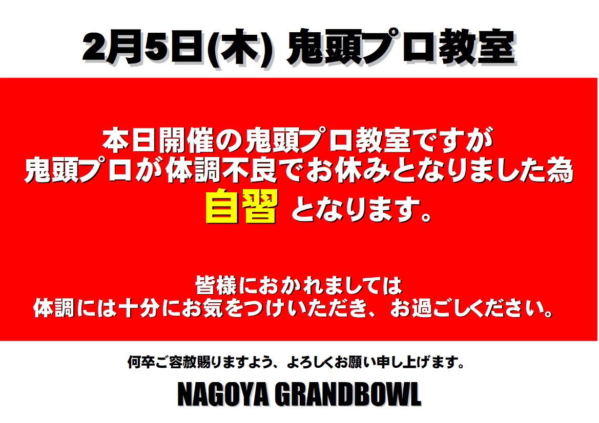 本日、2月5日(木)18時~開催の「鬼頭プロ教室」ですが、鬼頭プロが体調不良でお休みとなりました為 自習 となります。