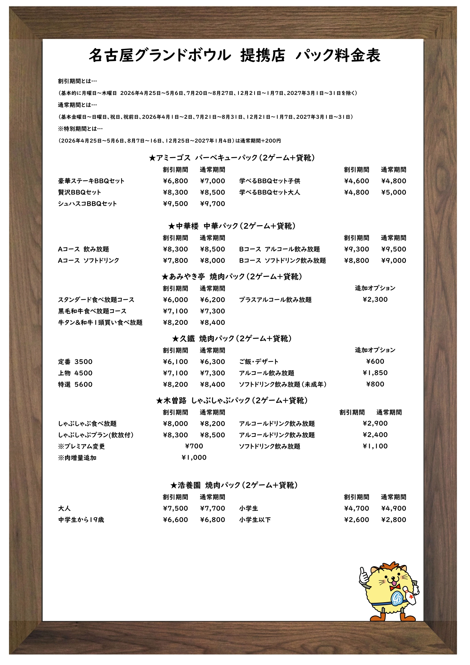 提携店食事プラン料金表