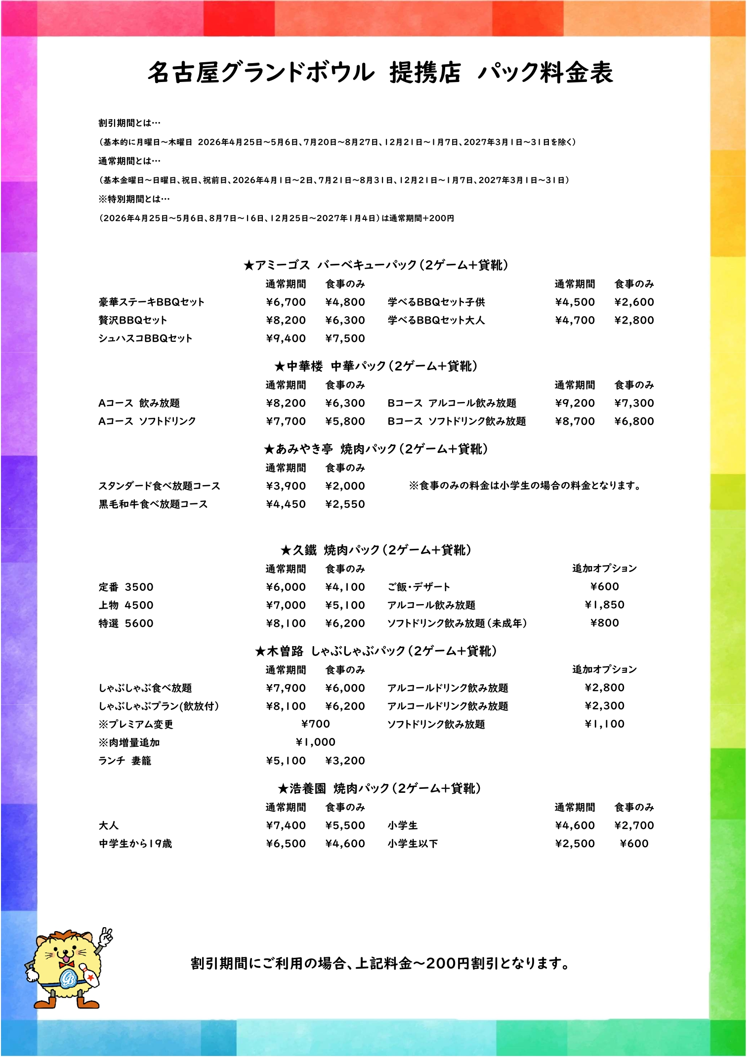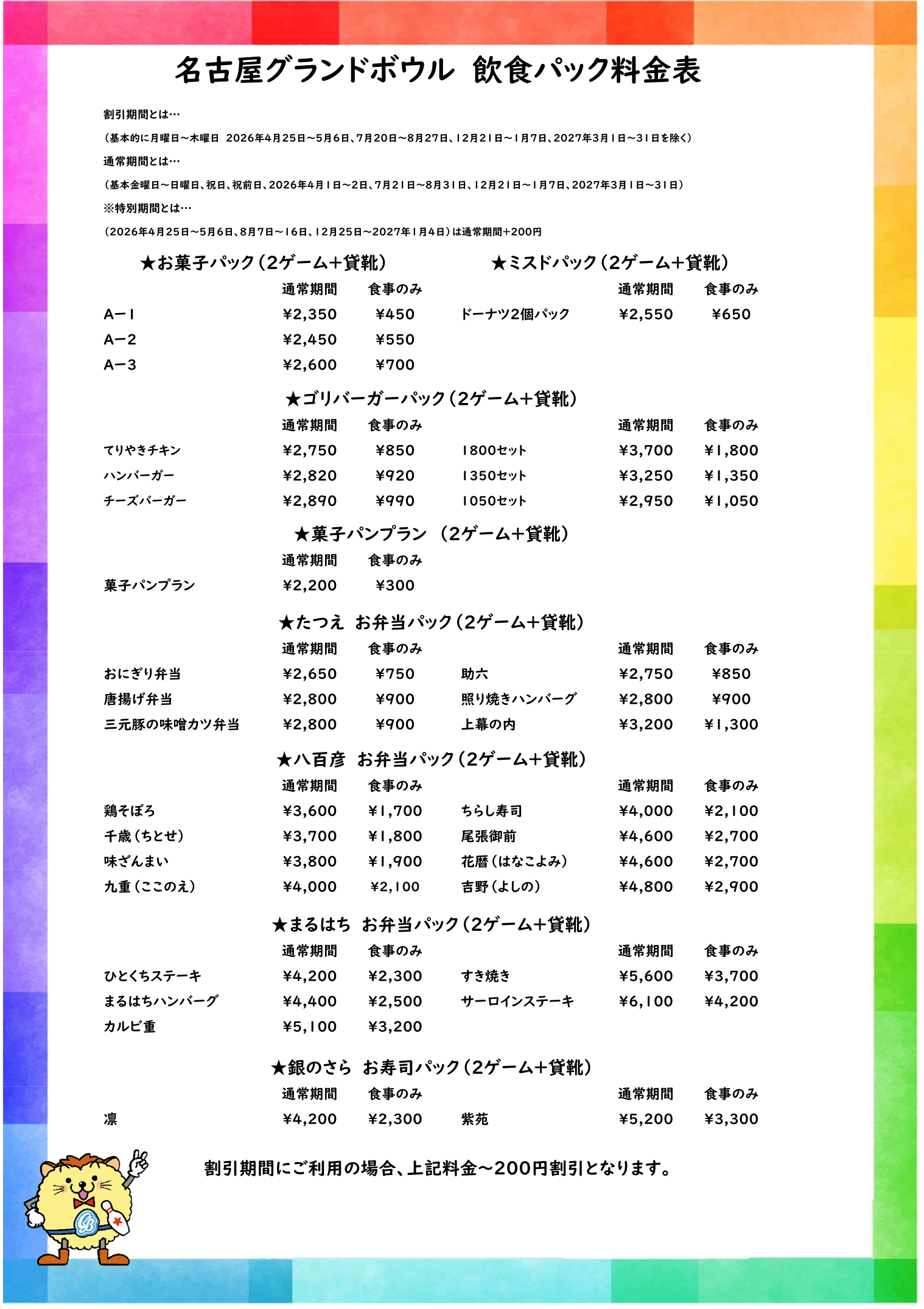 子ども会用 飲食プラン料金表