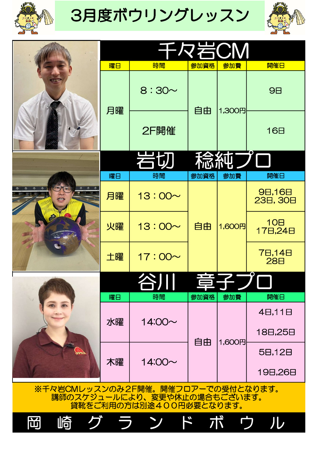 2026年3月度ボウリングレッスンスケジュール表になります。