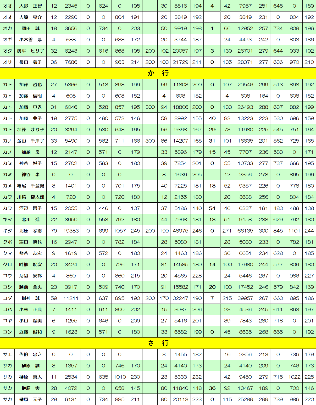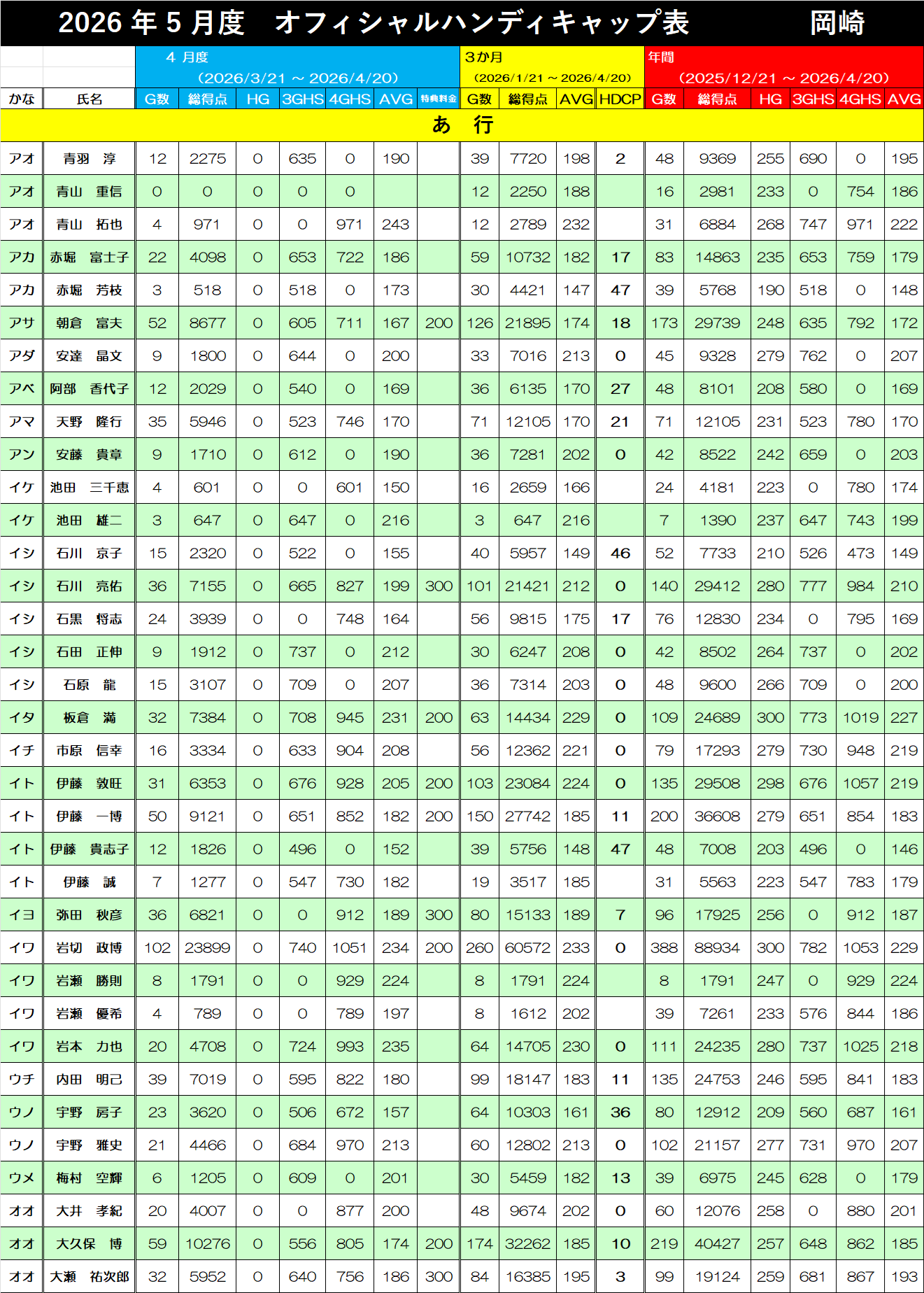 5月度オフィシャルハンディキャップ表です。(2026/2/21~2026/3/20集計分)