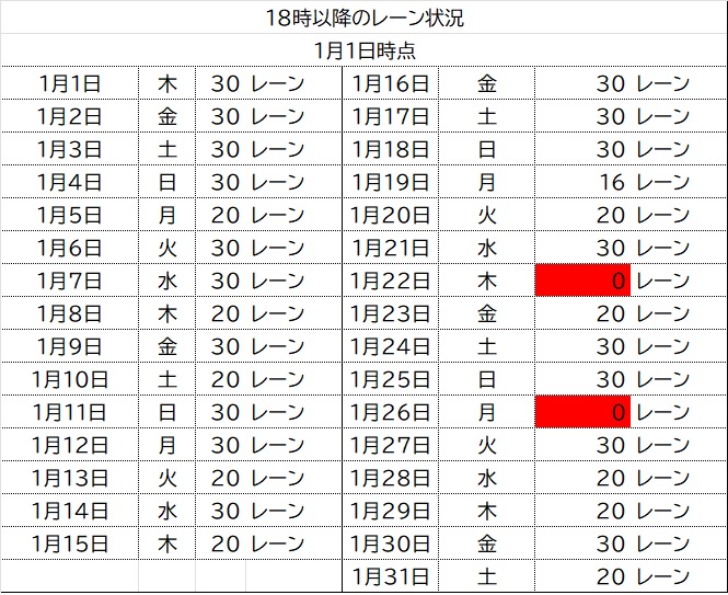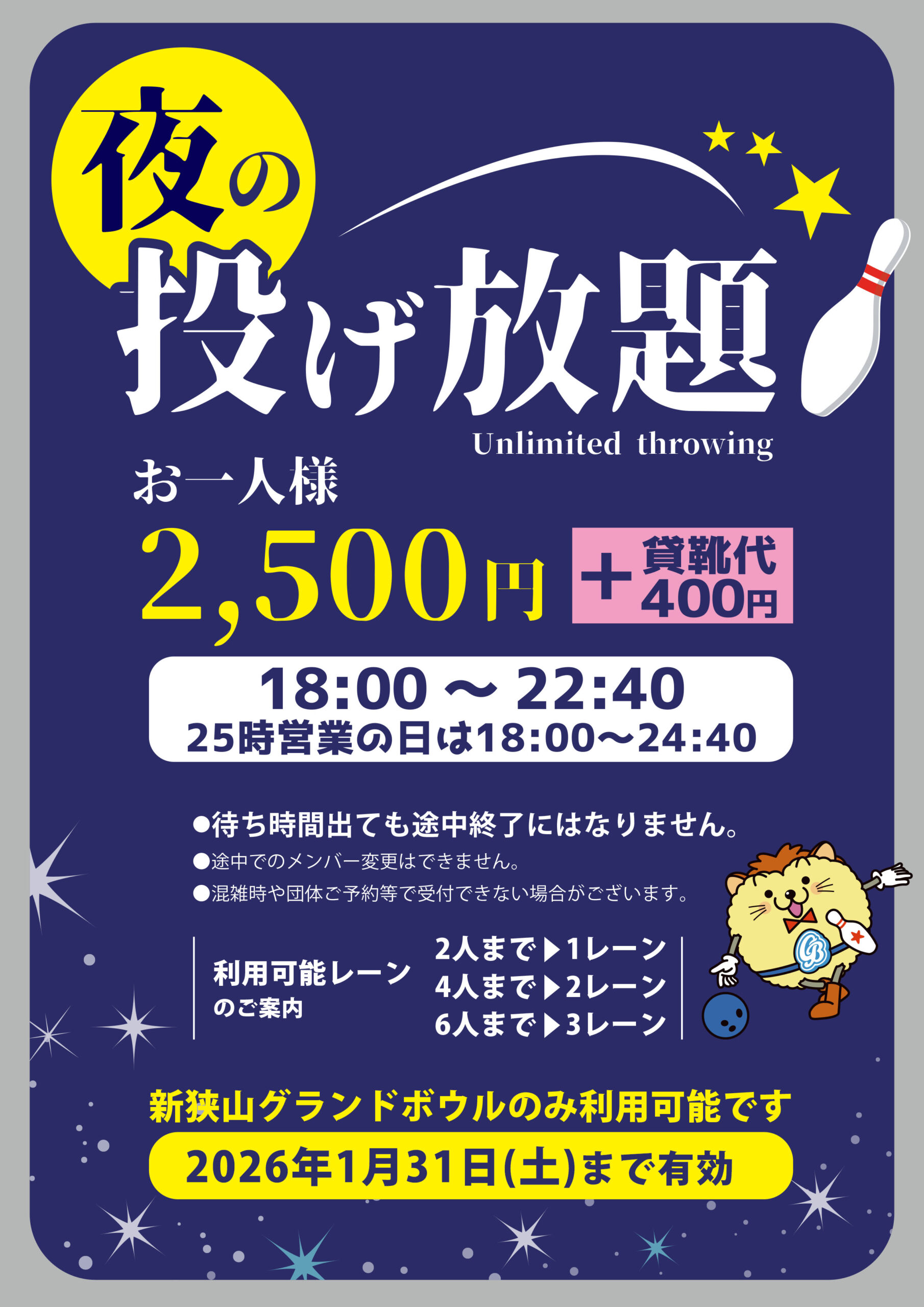 ご予約等、空きレーン状況により受付できない場合がございます。レーンが埋まり次第、受付終了となります。※ご予約はできませんのでご了承ください