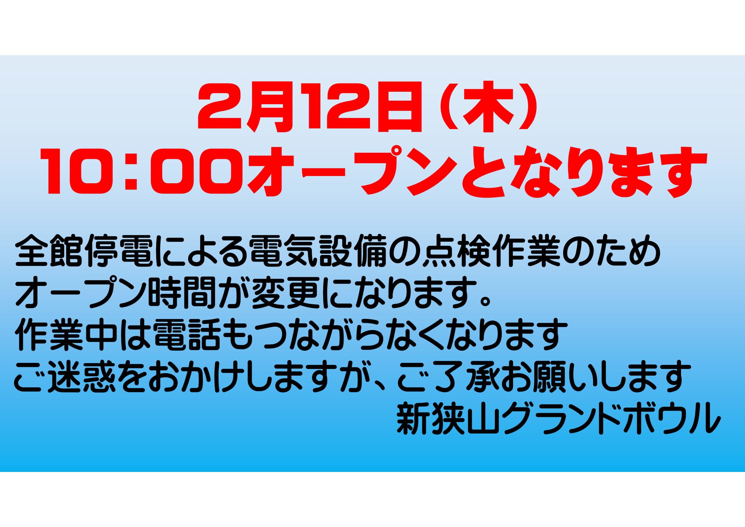 2月12日(木)全館停電作業によるオープン時間変更のお知らせ