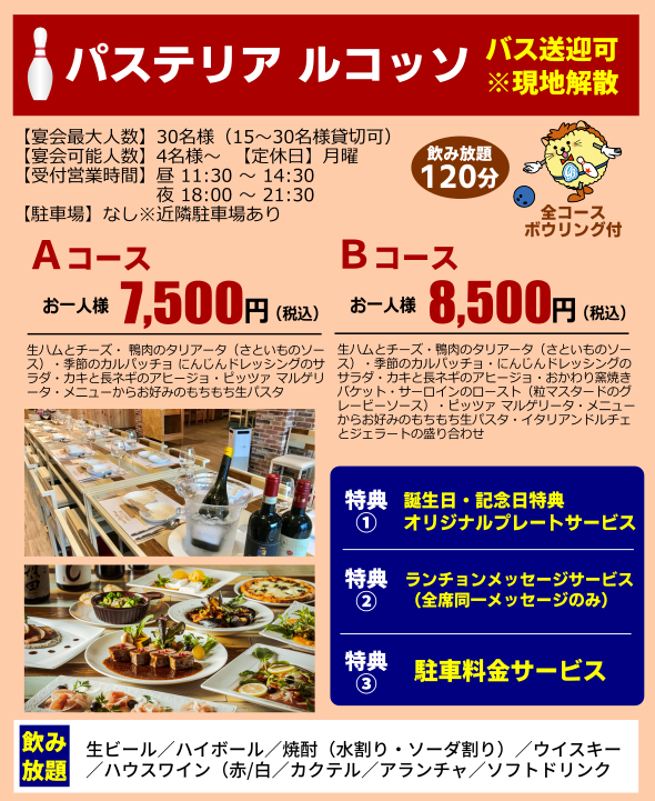 | 提携店でのご宴会やケータリングなどが、ボウリングとひとつになったお得なパックプラン! 飲み放題も付いているのでとってもお得!(※一部除外あり) 歓送迎会や送別会、暑気払い、忘年会や新年会など、各種ご親睦会にピッタリ! |